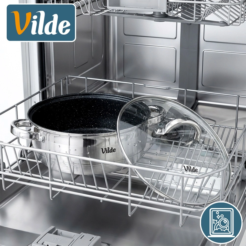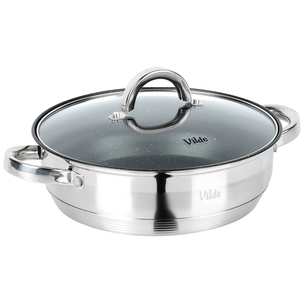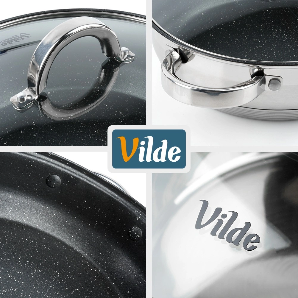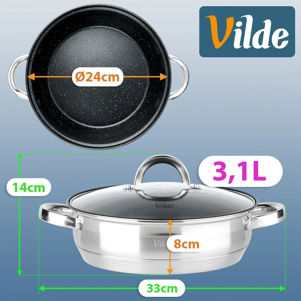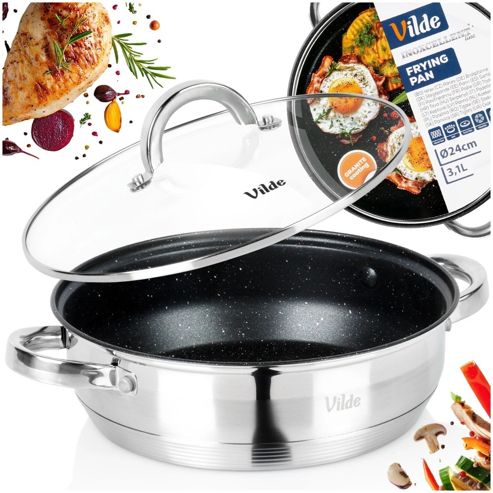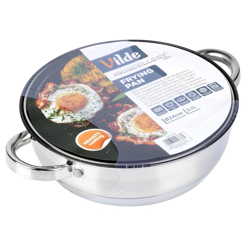 Vnitřek pánve je opatřen odolnou nepřilnavou vrstvou se žulovým efektem, vnějšek kombinuje matnou a vysoce leštěnou úpravu. Výrobek splňuje evropské standardy kvality. Originální produkt značky Vilde z linie INOXCELLENT.
