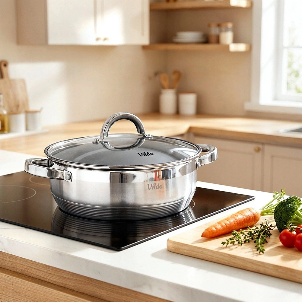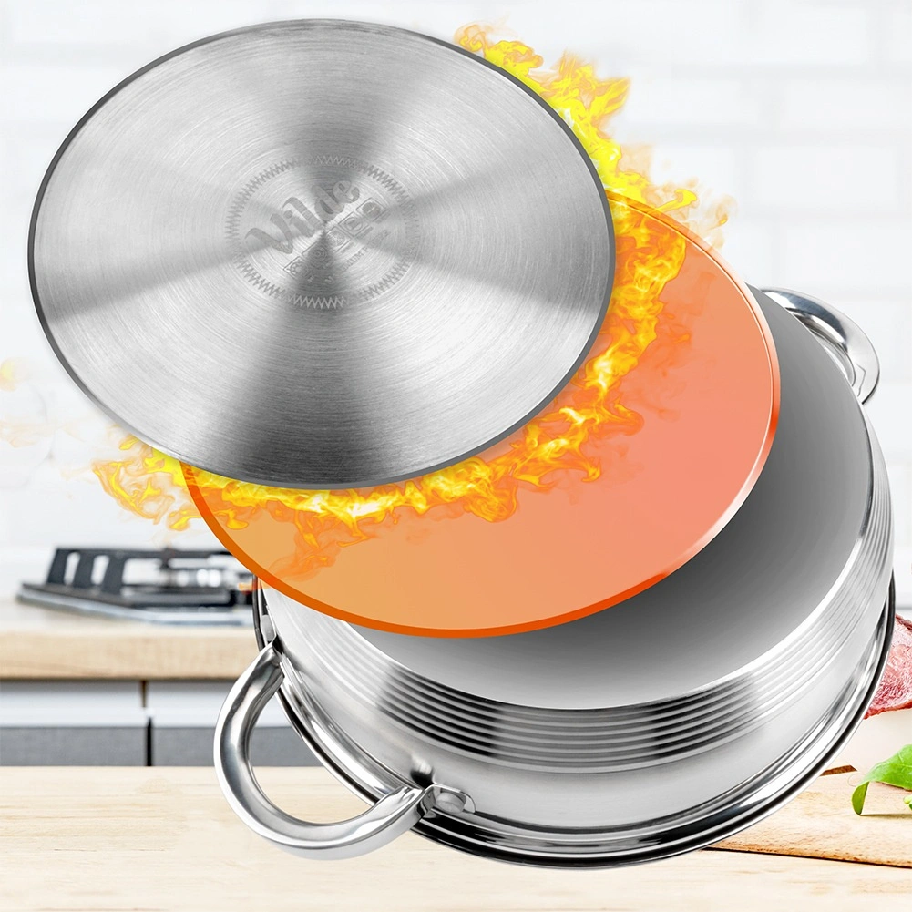 Vícevrstvé, dokonale rovné dno účinně akumuluje a rovnoměrně rozvádí teplo. Šetří energii a zajišťuje stabilní výsledky na všech typech varných desek včetně indukce.