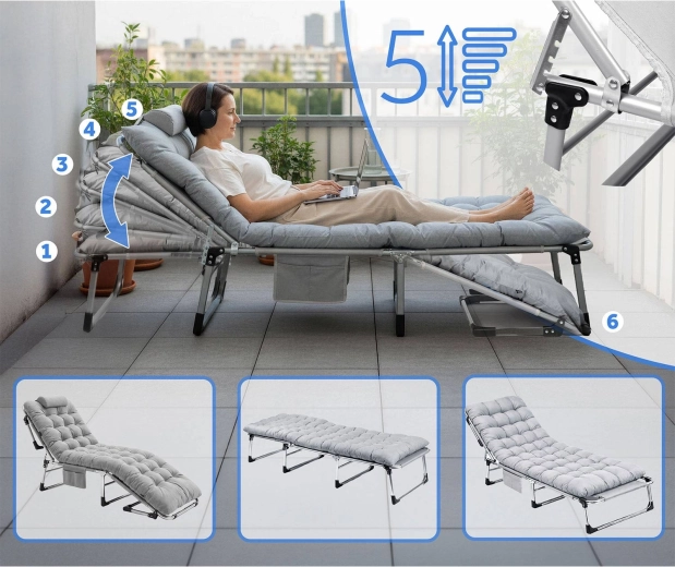 Skládací lehátko a polní lůžko ChillWell Dream je navrženo pro maximální komfort při relaxaci i spánku. Ergonomická konstrukce poskytuje pevnou oporu celému tělu, zatímco 5stupňová regulace opěradla a sklopná sekce nohou umožní zvolit přesně takovou polohu, jaká vám vyhovuje – od úplného lehu až po pohodlné pololežení při čtení.