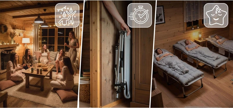 Odolný kovový rám, protiskluzové patky a rychlé skládání. Po složení je lehátko kompaktní, zajištěné pásky a uložené v přenosné tašce.
