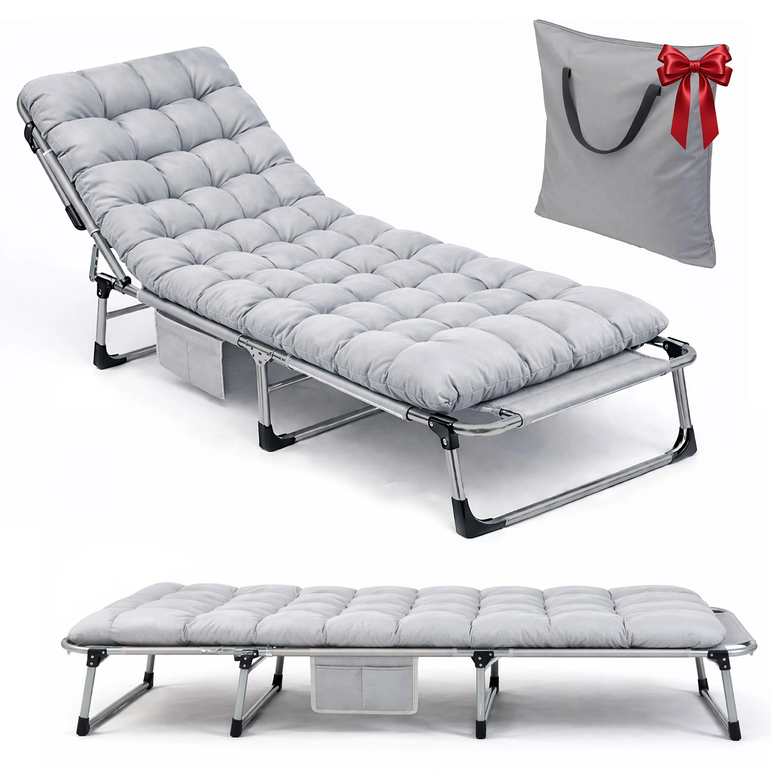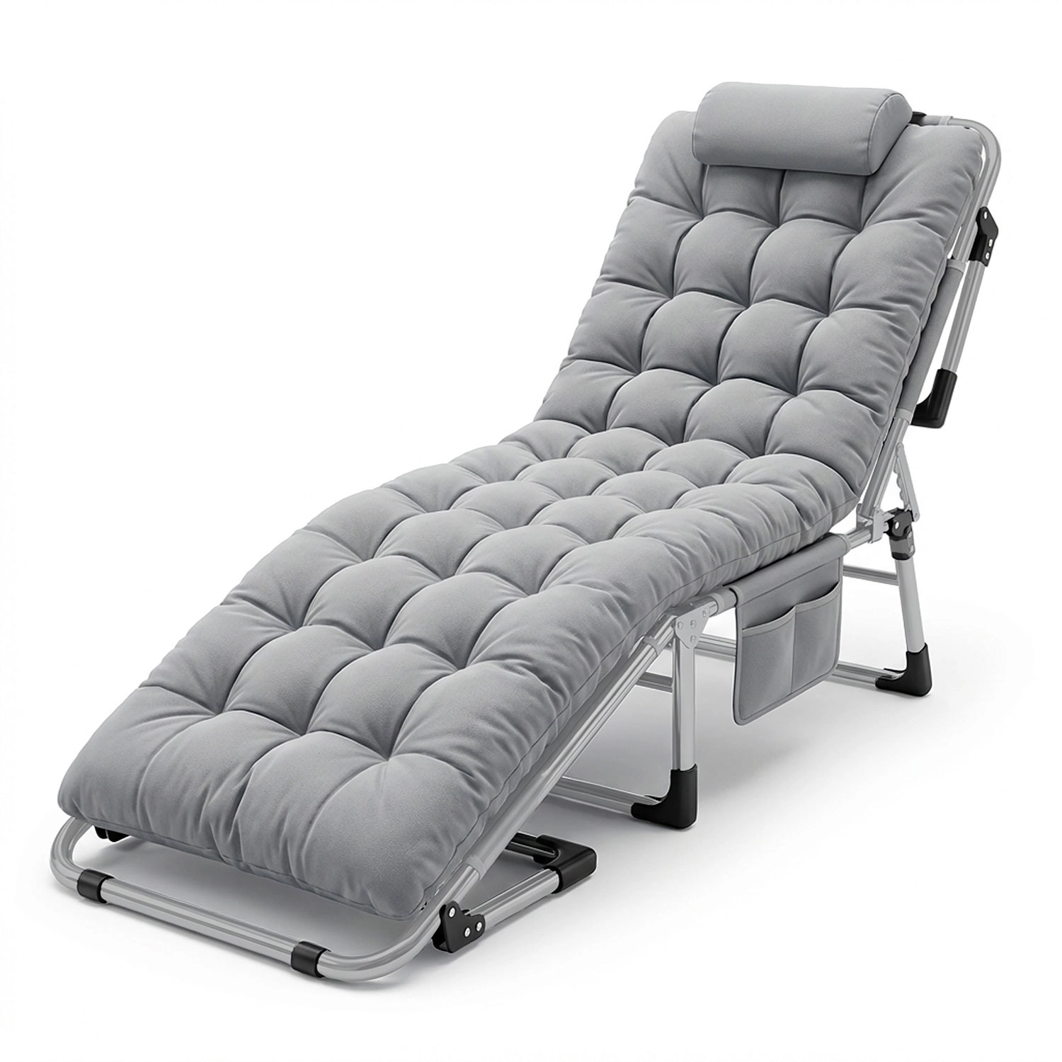 Díky kovovému rámu a protiskluzovým koncovkám nohou je lehátko stabilní a odolné pro venkovní použití. Silný, měkký matrac s podhlavníkem zůstává nadýchaný a pohodlný i při častém používání. Praktická boční kapsa udrží telefon, knihu nebo láhev po ruce. Po složení je lehátko kompaktní, zajištěné pásky na suchý zip a uložené v přepravní tašce.