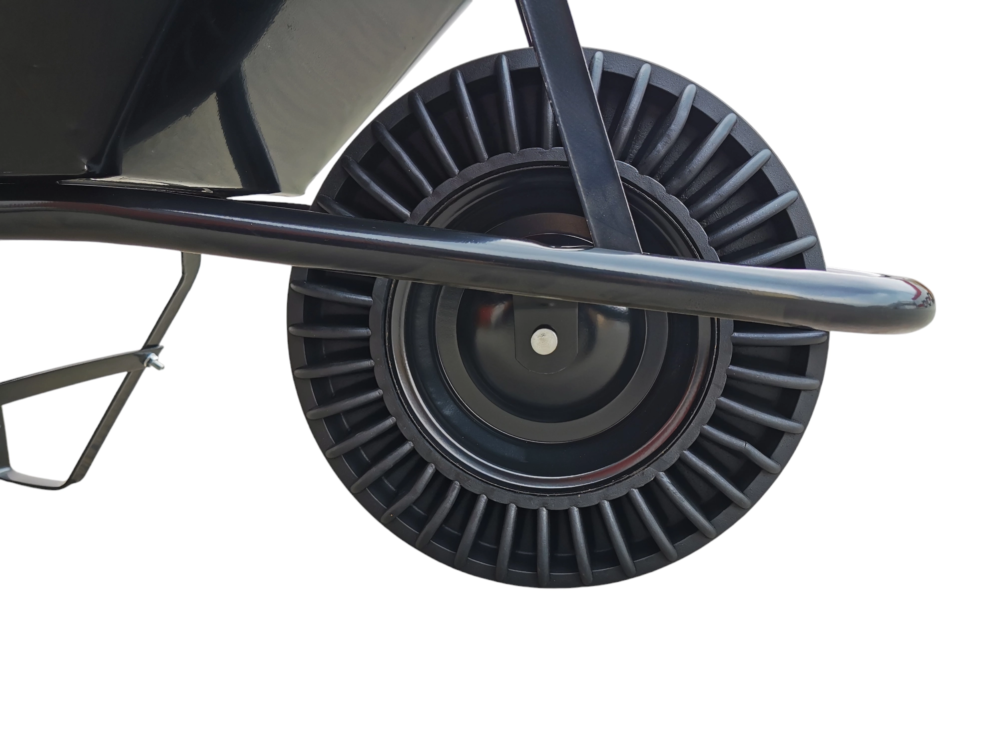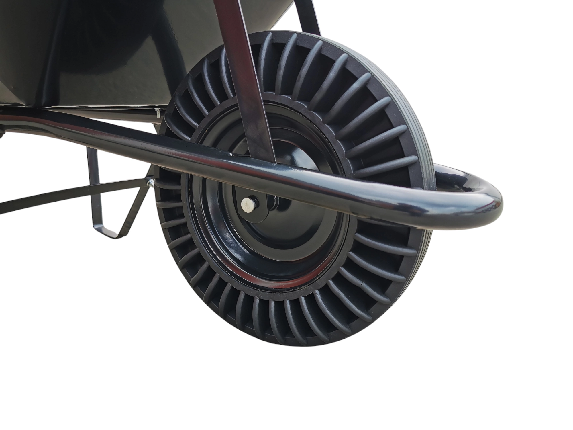 Kolo z plné pryže eliminuje riziko propíchnutí a nutnost huštění. Spolehlivě zvládne stavební suť, ostré kamínky i nerovný terén.