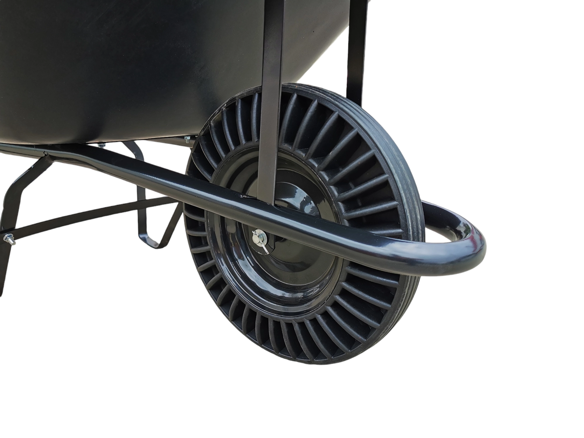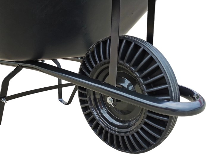 Kolo z plné pryže (bantam) zajišťuje plynulý pohyb i v nerovném terénu, nevyžaduje huštění a je odolné proti propíchnutí. Ideální pro časté použití na zahradě či statku.