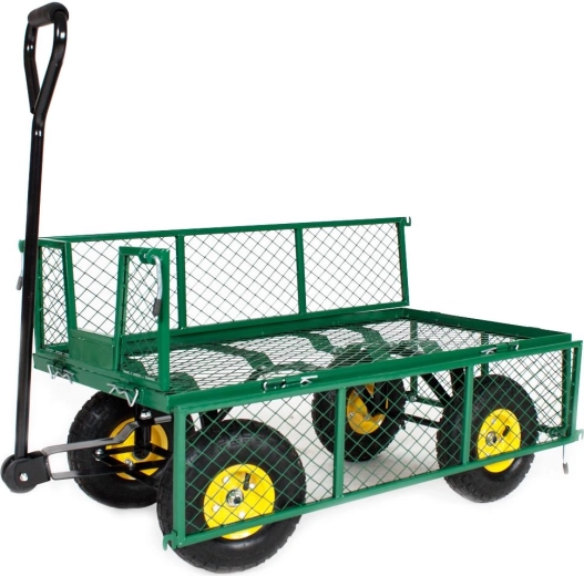 Ulehčete si práci na zahradě s tímto odolným vozíkem, který kombinuje stabilní čtyřkolovou konstrukci a prostornou drátěnou korbu o rozměru 960 × 565 × 200 mm. Nafukovací kola s průměrem 26 cm dobře tlumí nerovnosti a zajišťují plynulý pohyb i v terénu.