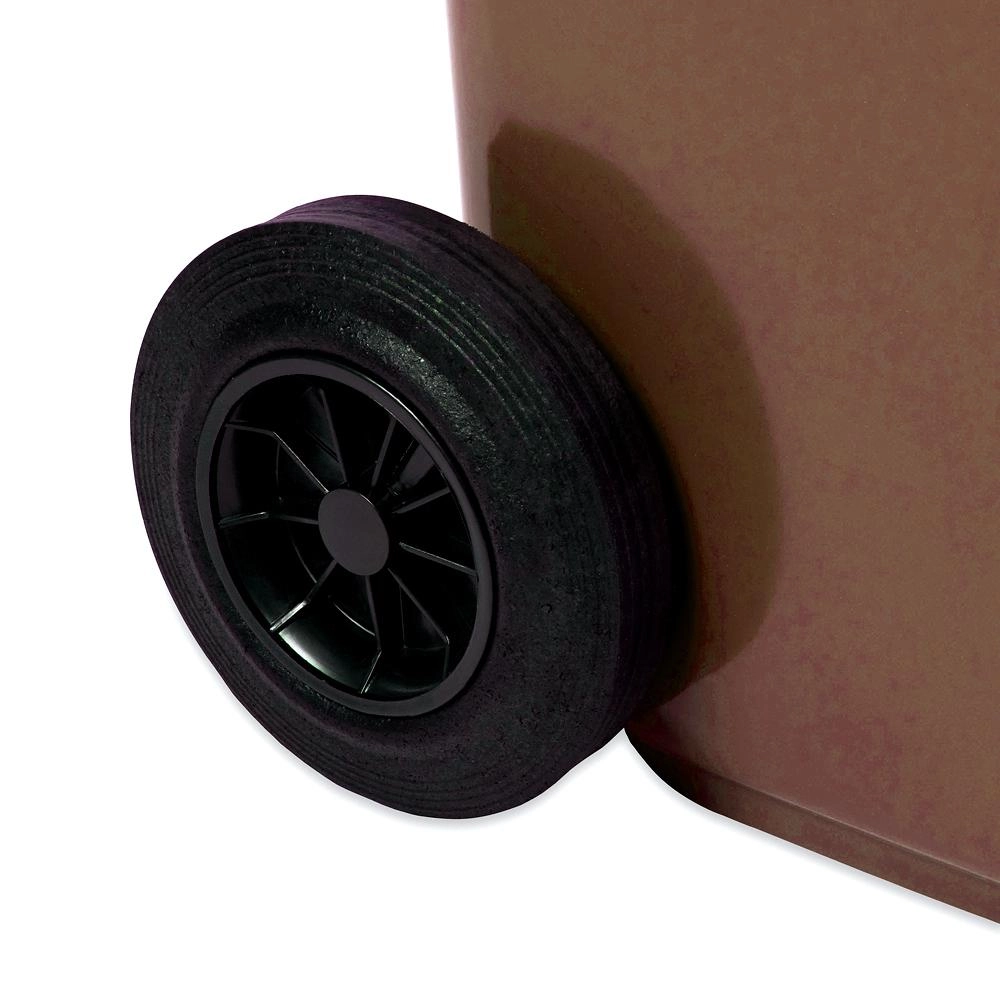 Dvě robustní zadní kola a praktické madlo umožňují pohodlné přemístění popelnice i při plném zatížení po dlažbě či nerovném povrchu.