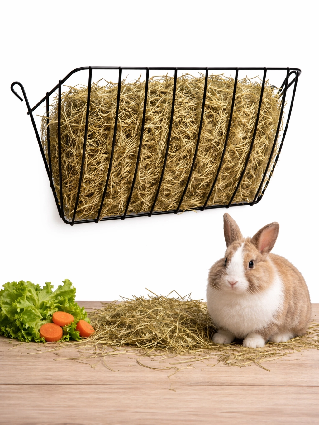 Velké jesle na seno pro králíky s praktickým horním plněním zaručují čisté a hygienické podávání sena. Otevřená drátěná konstrukce umožňuje zvířatům snadný přístup, zatímco seno zůstává nad podestýlkou a neplýtvá se.