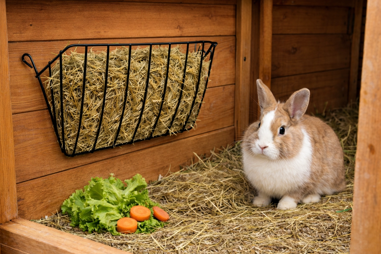 Plňte jesle shora a udržte seno nad podestýlkou – méně odpadu, více čistoty a lepší hygiena v králíkárně.
