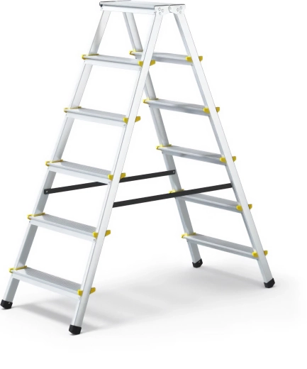 Tyto profesionální oboustranné schůdky 2x6 jsou navrženy pro bezpečnou a pohodlnou práci ve výšce. Široké žebrované stupně s protiskluzovou úpravou a plastovými kryty zajišťují jistý krok, zatímco pevná pracovní plošina poskytuje stabilní stanoviště pro delší úkony.