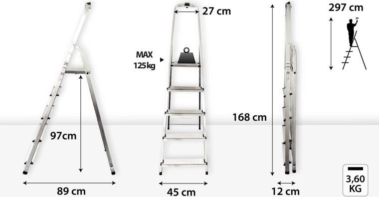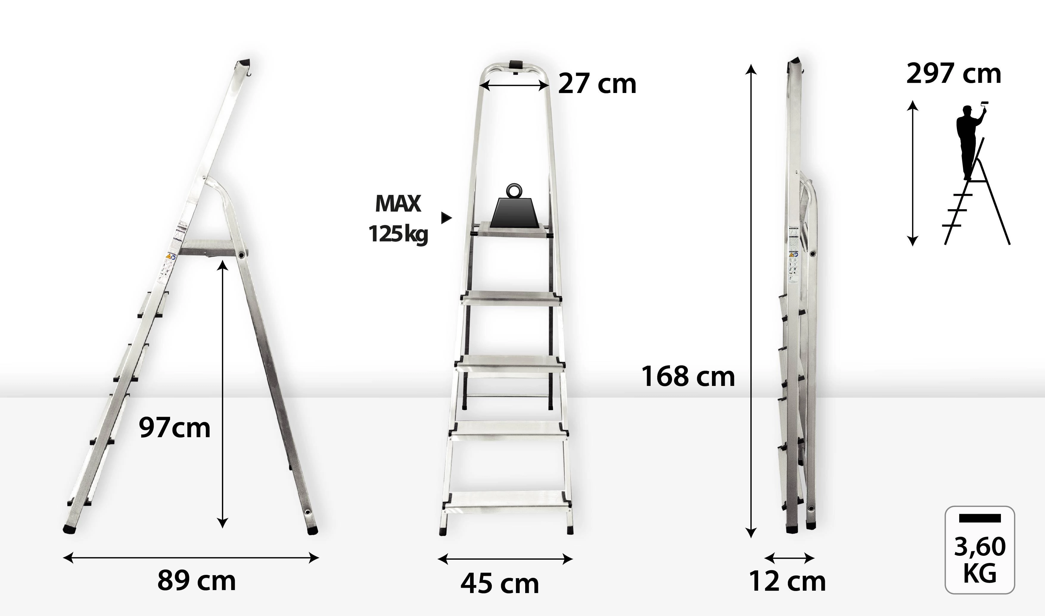 Lehké a odolné hliníkové schůdky s pěti širokými stupni a stabilní pracovní plošinou jsou ideální pro domácnost i dílnu. Nabízí bezpečné madlo 60 cm, protiskluzové nožičky a vroubkované stupně pro maximální stabilitu. Díky nosnosti 125 kg a pracovní výšce až 2,97 m se snadno dostanete i do vyšších poloh.