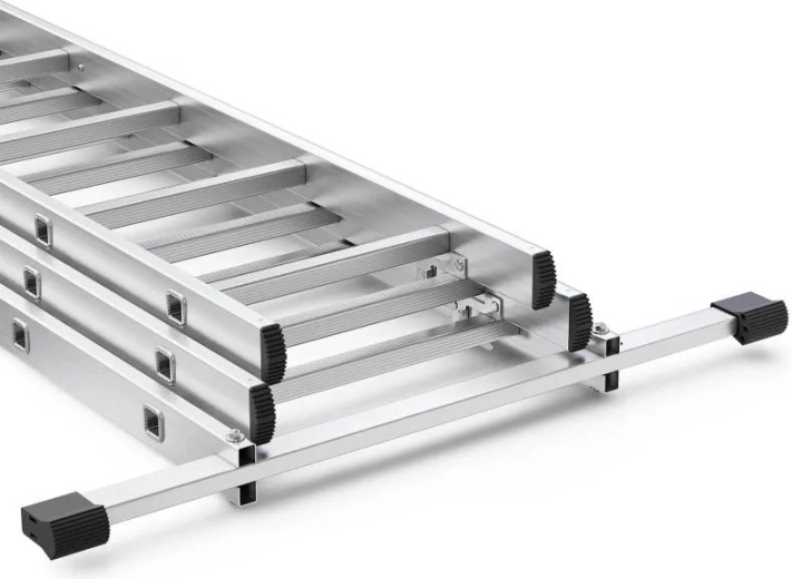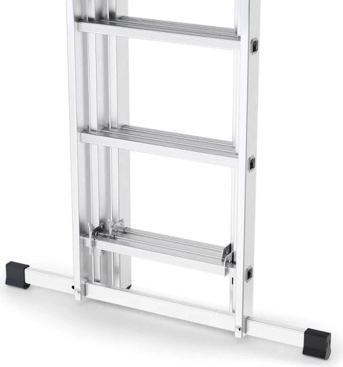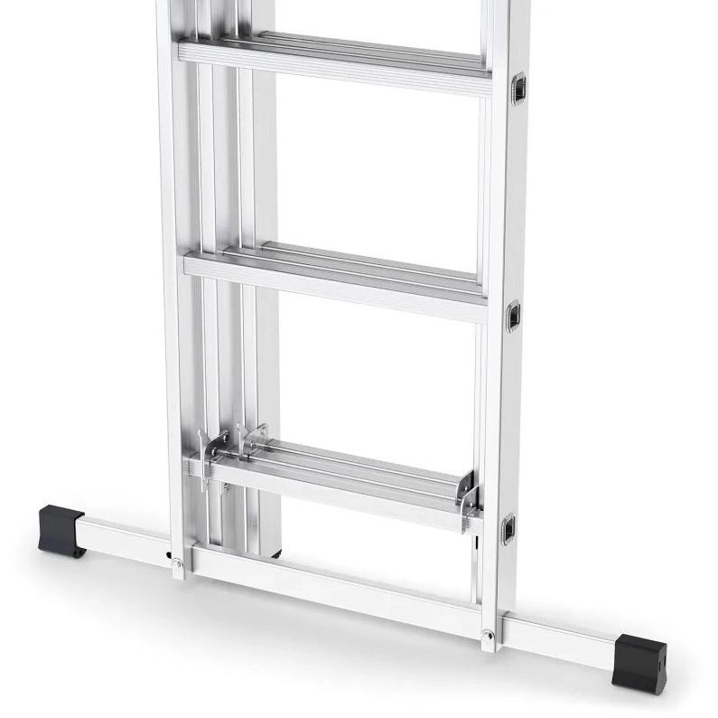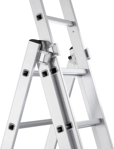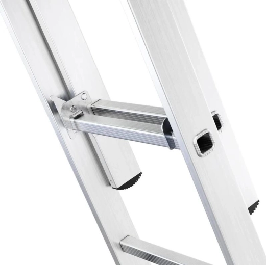 Automatické zámky umožňují rychlé a bezpečné nastavení žebříku v několika konfiguracích – jako opěrný, do tvaru A nebo pro práci na nerovném terénu. Vroubkované, široké příčky zvyšují komfort a bezpečnost při výstupu.