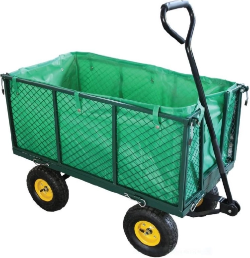 Robustní čtyřkolový vozík je navržen pro spolehlivý a bezpečný transport nákladu. Drátěná korba s vysokými bočnicemi zajišťuje stabilitu převážených předmětů a minimalizuje riziko vysypání. Díky kompaktním rozměrům se snadno ovládá i v užších uličkách.