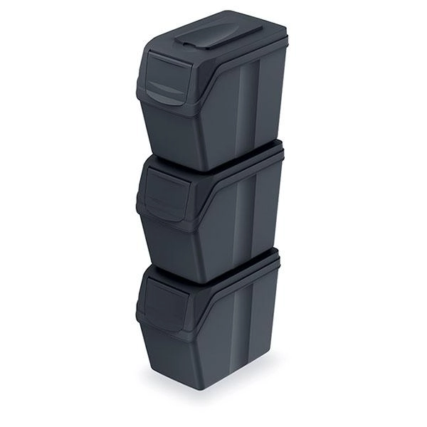 Sada Sortibox v elegantní antracitové barvě přináší promyšlené a úsporné řešení třídění. Každý koš o objemu 20 l je navržen tak, aby se pohodlně vešel i do menších prostor, aniž by narušil vzhled interiéru. Odolný plast zajišťuje dlouhou životnost a snadnou údržbu.