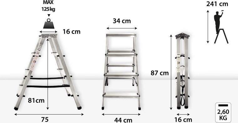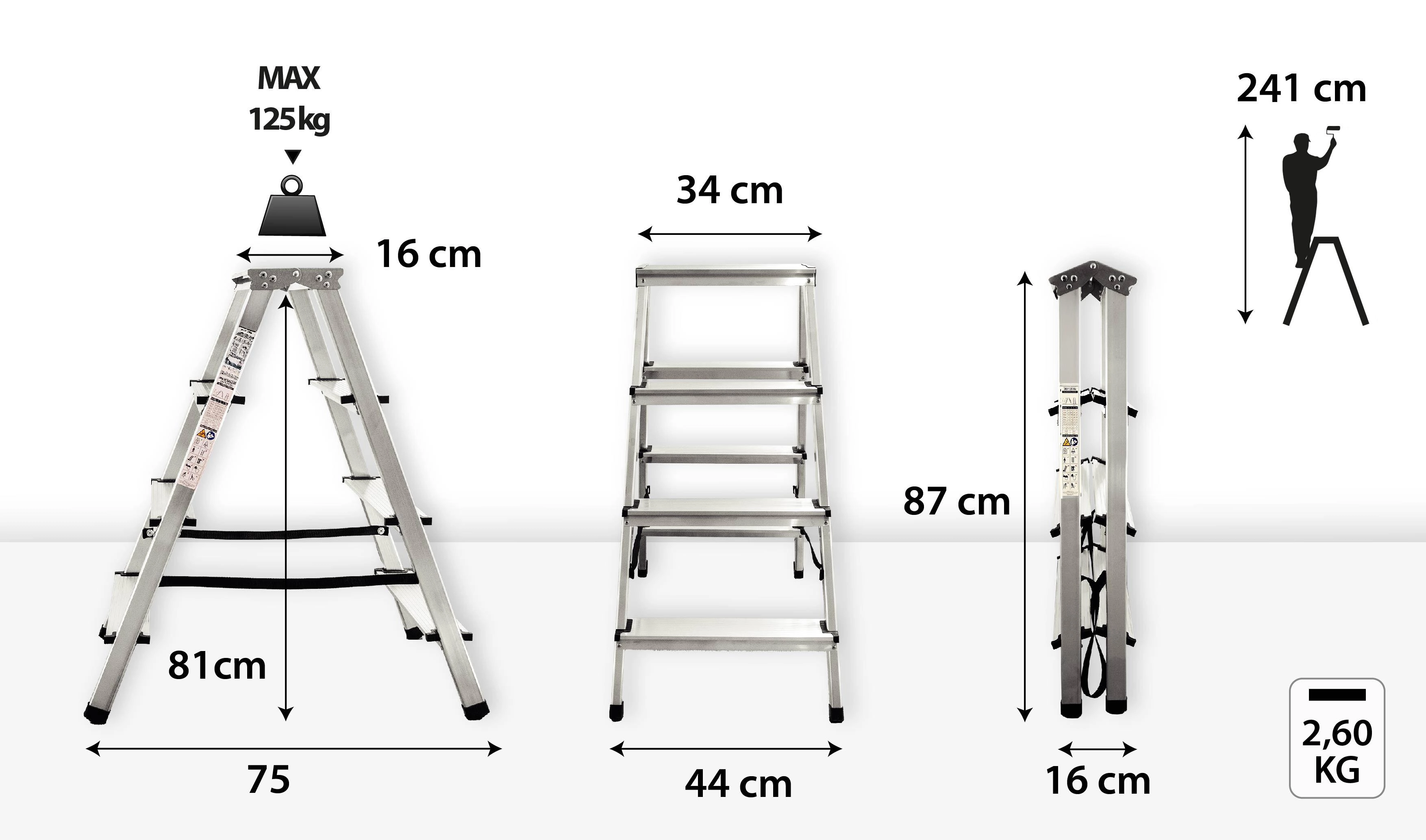 Robustní zpracování s nosností 125 kg poskytuje bezpečné zázemí pro práci ve výšce, ať už potřebujete malovat, dosáhnout na vyšší police nebo provádět drobnou údržbu. Díky kompaktním rozměrům jsou schůdky skladné a nezaberou mnoho místa.