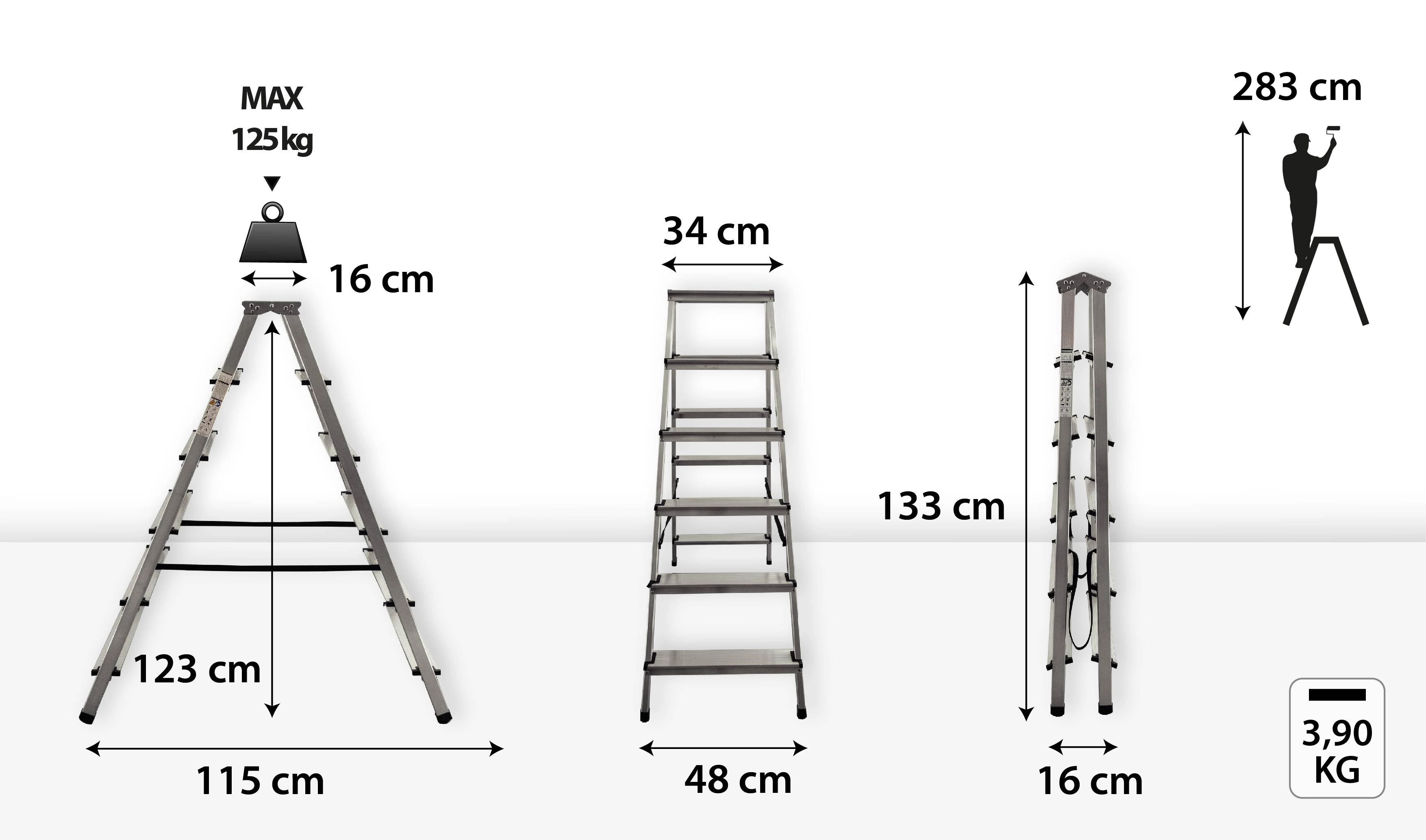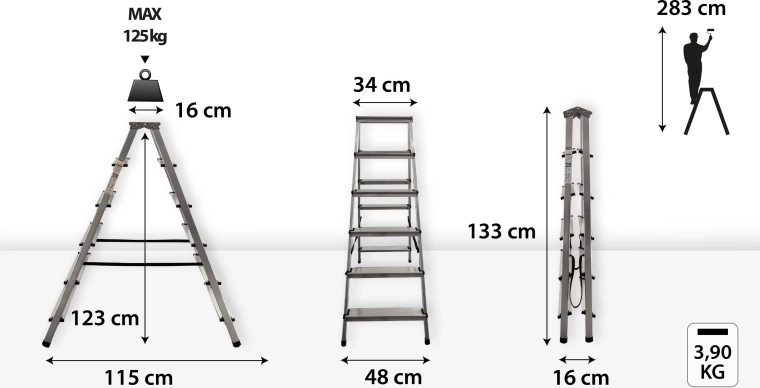 Díky výšce schůdků 1,33 m a pracovní výšce až 2,83 m pohodlně dosáhnete na vysoké skříně, police i stropy. Hliníková konstrukce je odolná a snadno přenositelná (pouze 3,9 kg), což usnadňuje manipulaci i skladování v menších prostorech.