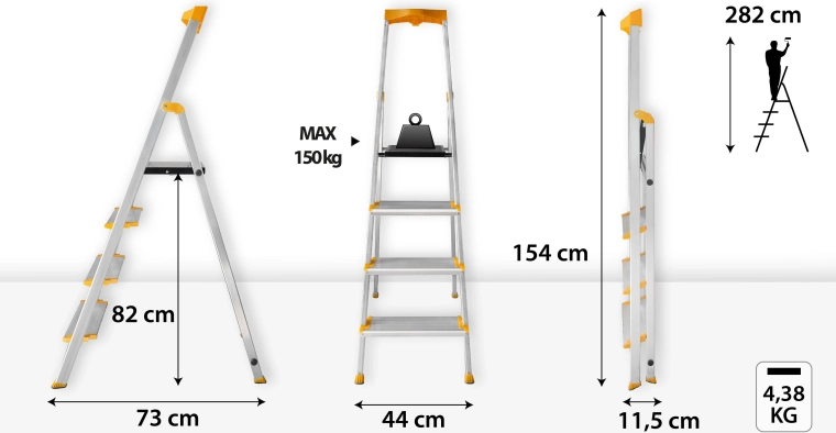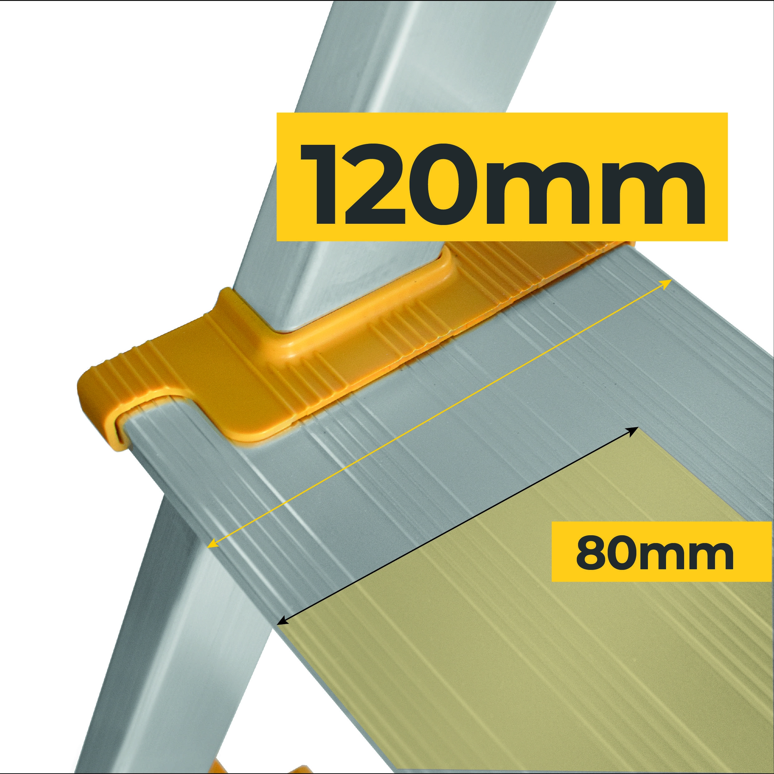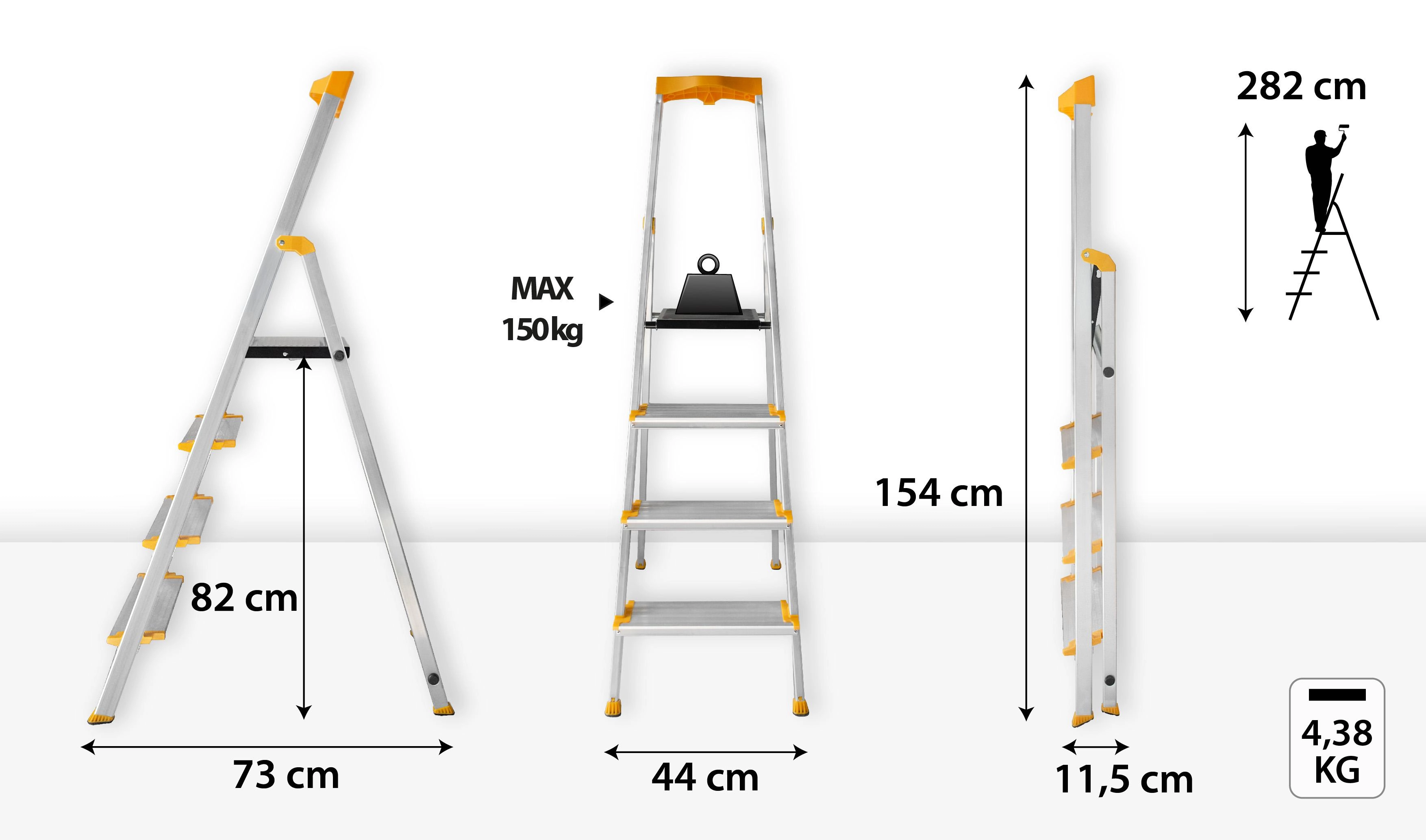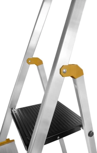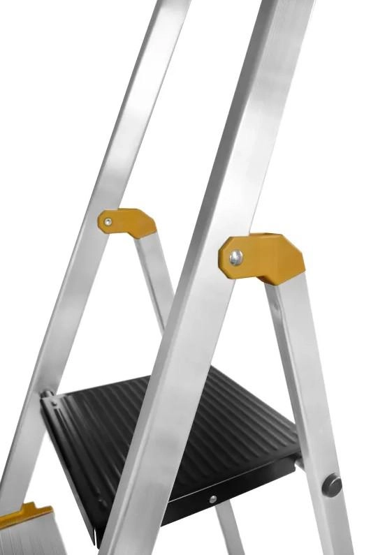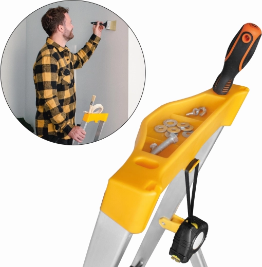 Díky bezpečnostnímu madlu s praktickou poličkou na nářadí máte vše potřebné vždy po ruce. Schůdky se snadno skládají a rozkládají, jsou skladné a připravené k rychlému použití kdekoliv je potřeba.