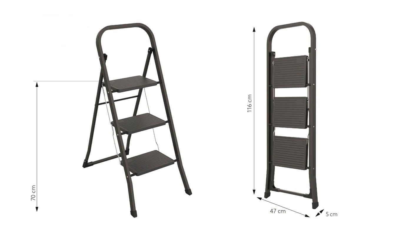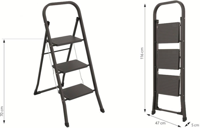 Tyto jednostranné třístupňové schůdky jsou ideální volbou pro domácí práce – od úklidu po výměnu žárovek. Stabilní ocelový rám s práškovým lakem zajišťuje dlouhou životnost, zatímco bezpečné madlo a protiskluzové nožky dodávají jistotu při každém kroku.
