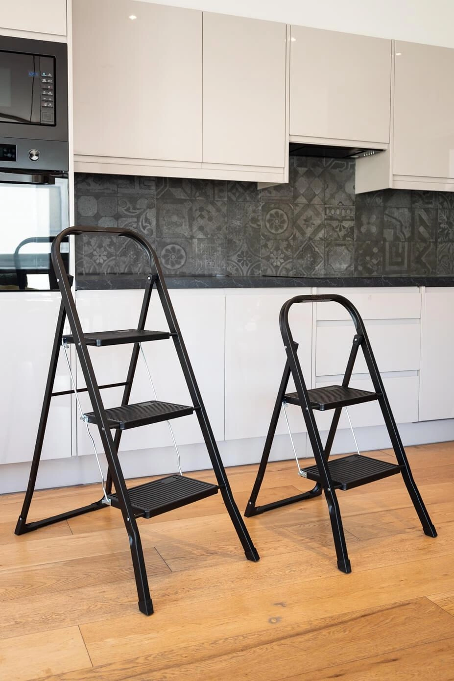 Schůdky jednoduše složíte do plochého tvaru, takže je snadno uložíte do komory či za skříň.
