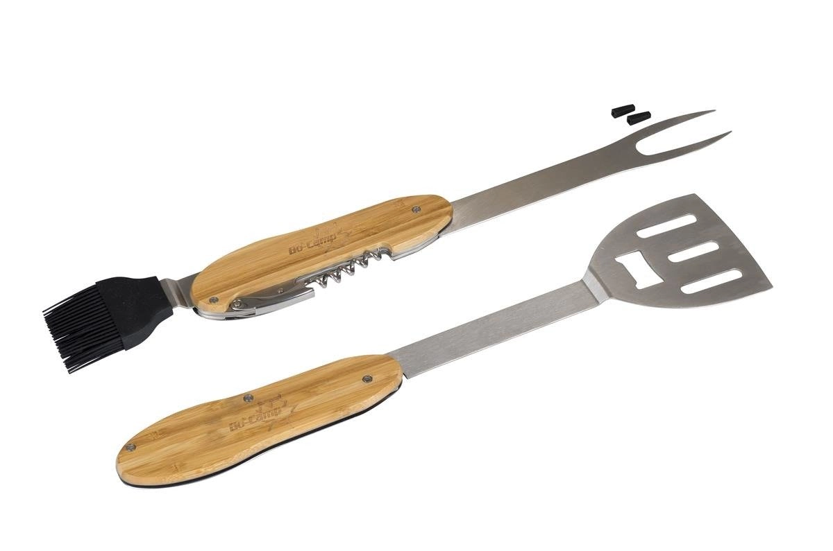 Praktické a odolné grilovací nářadí 5v1 kombinuje obracečku, vidličku, silikonový mašlovač, korkový šroub a otvírák lahví v jednom kompaktním setu. Ergonomické bambusové rukojeti a nerezová ocel zajistí pohodlné a dlouhotrvající používání u každého grilování.