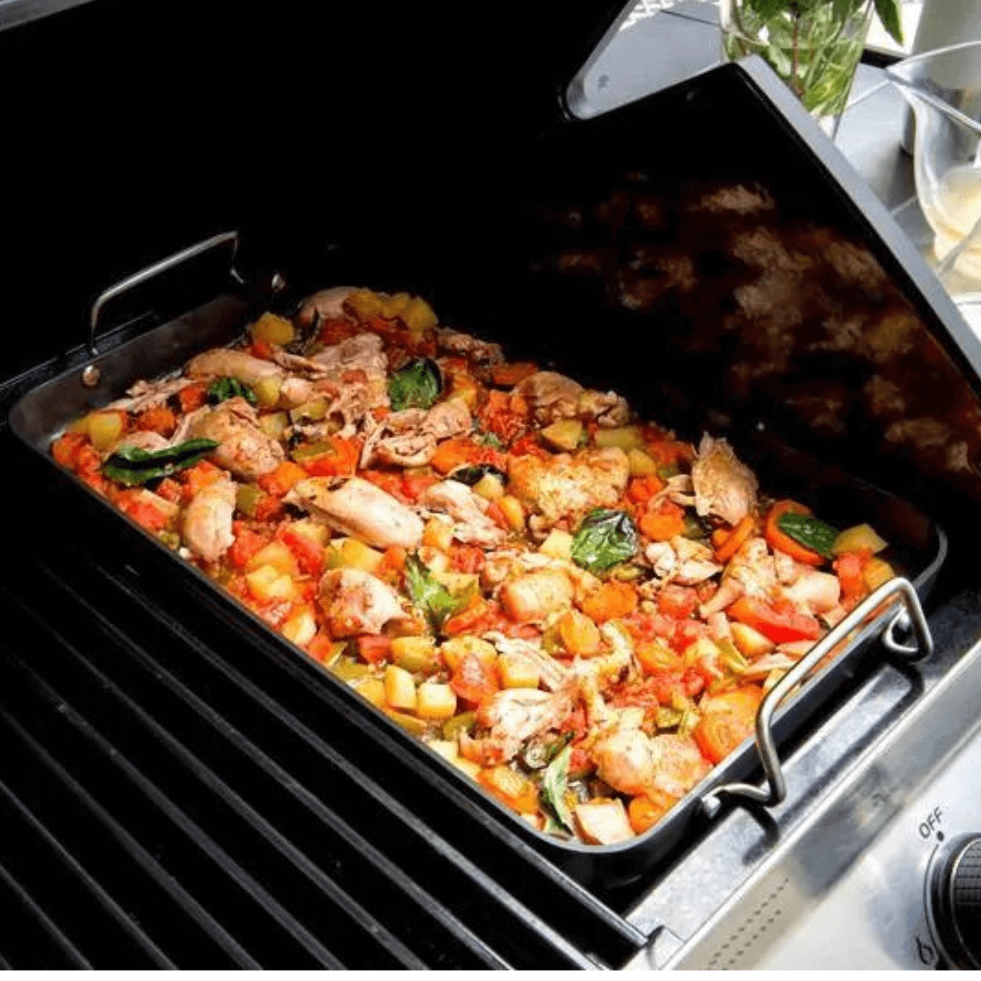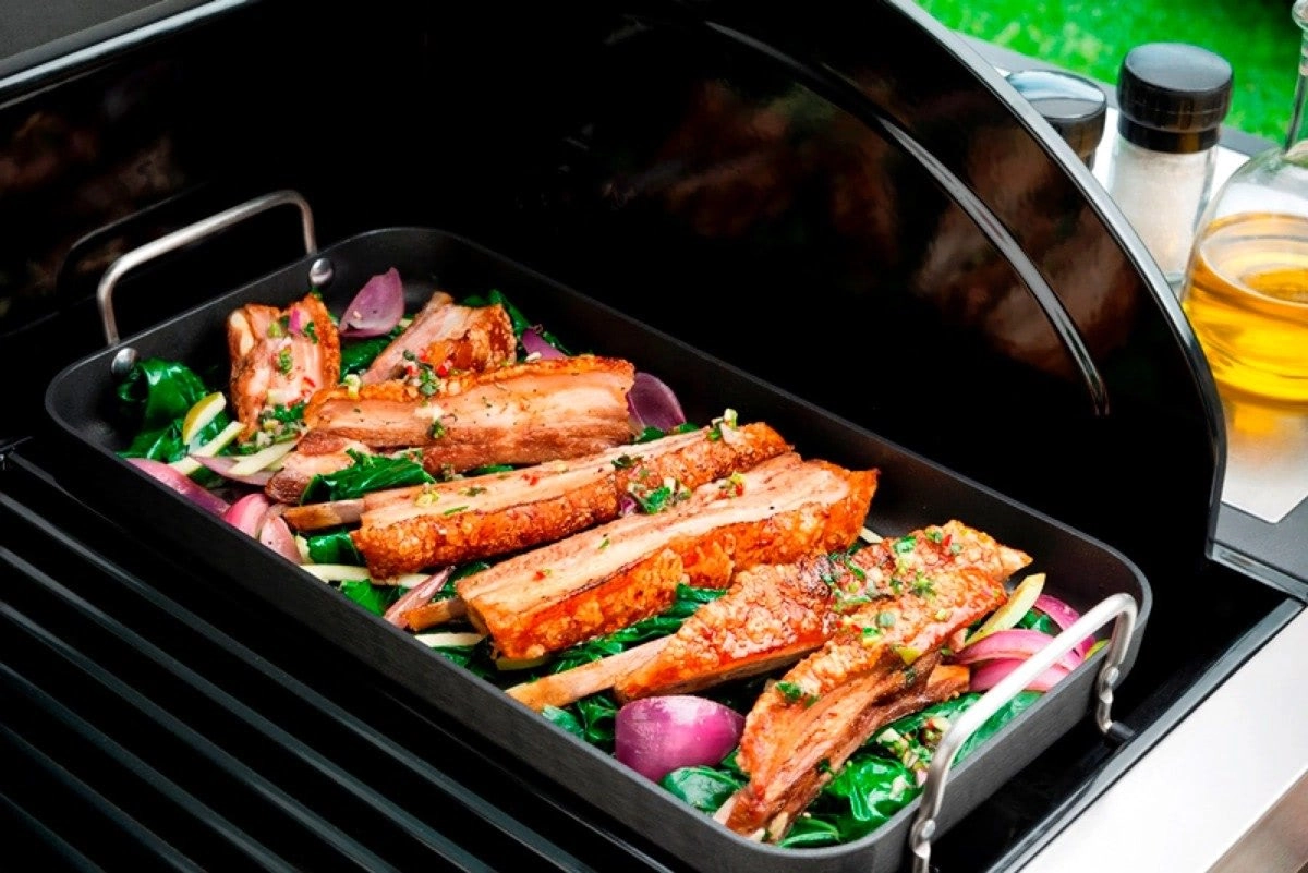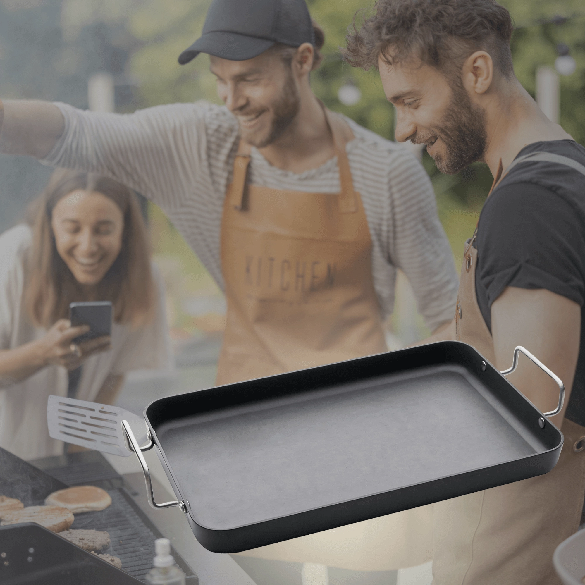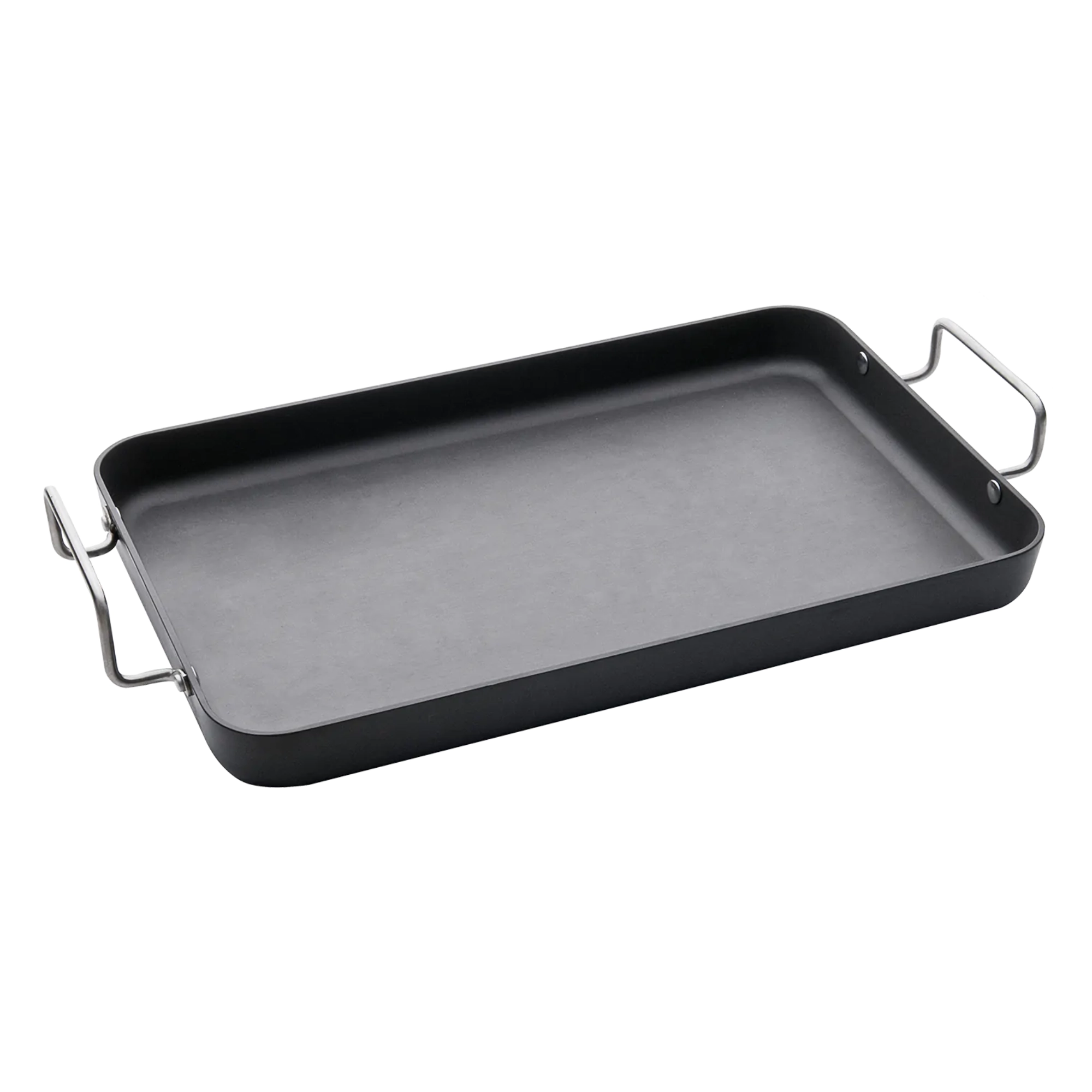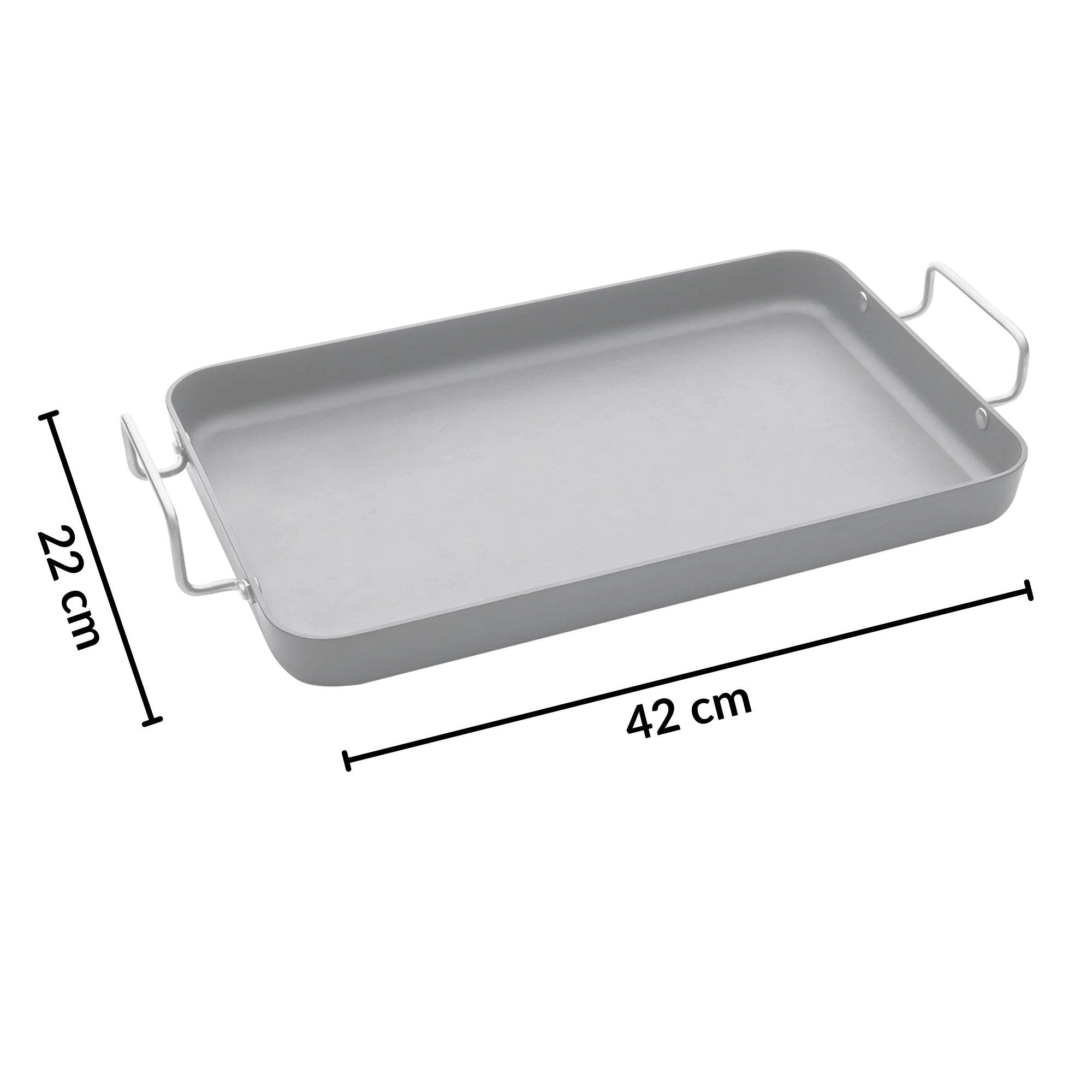 Obdélníkový tvar s nízkým okrajem zajišťuje efektivní kontakt s teplem a stabilní výsledky při grilování, smažení i pečení.