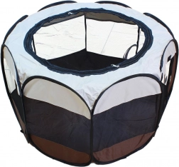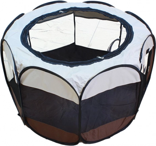 Praktická a bezpečná skládací ohrádka pro domácí mazlíčky i děti. Nabízí prostorný interiér, rychlé rozložení a odolné materiály (nylon, polyester). Vhodná do bytu i na zahradu, se zipovými vstupy, odnímatelnou síťovanou střechou a kolíky pro ukotvení v terénu.