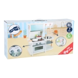 Přesvědčivost hry dodávají otáčecí knoflíky s cvakavými zvuky, zatímco trouba s magnetickým zavíráním slouží jako praktický úložný prostor. Kuchyňka dále obsahuje další police a háčky pro uložení maket potravin a nádobí.