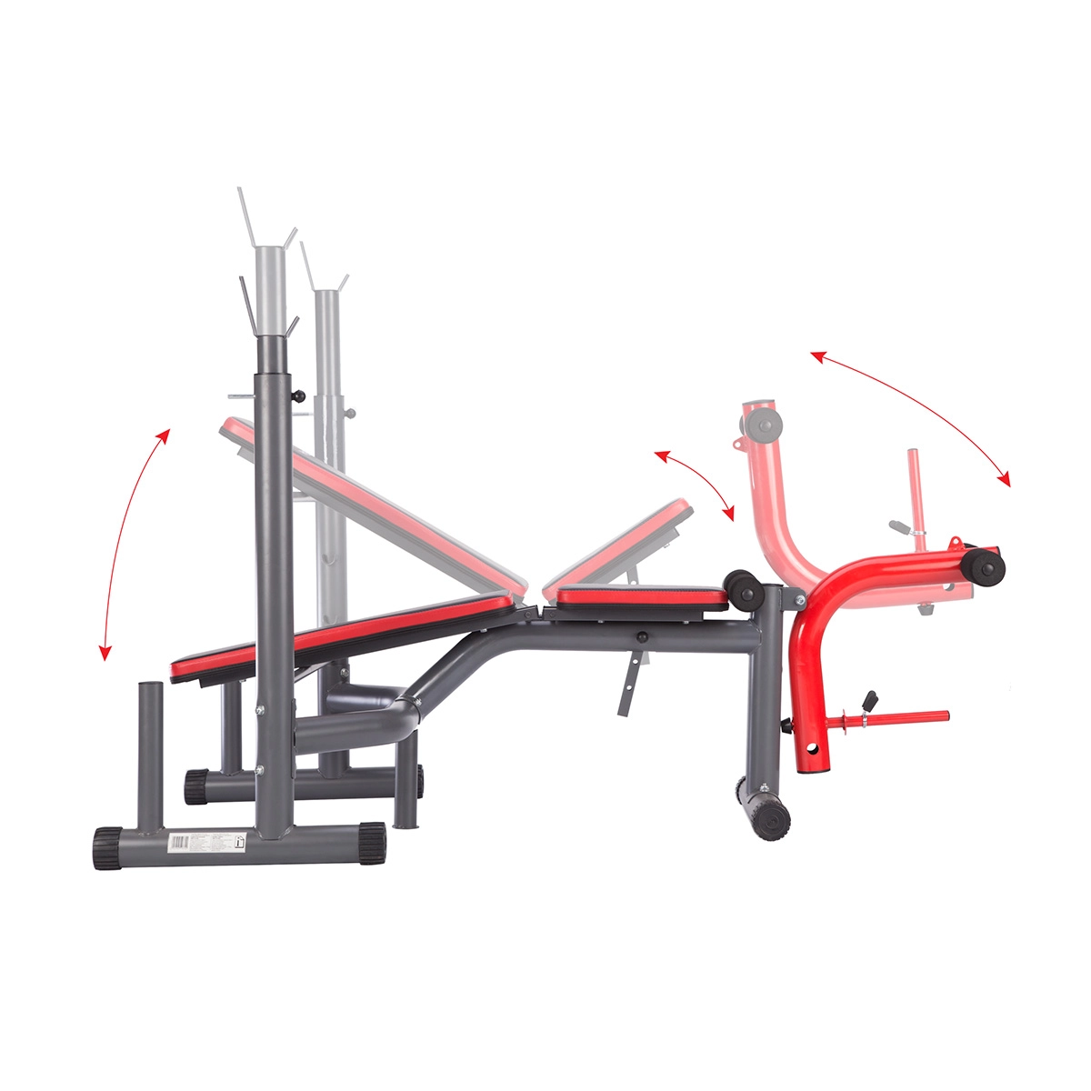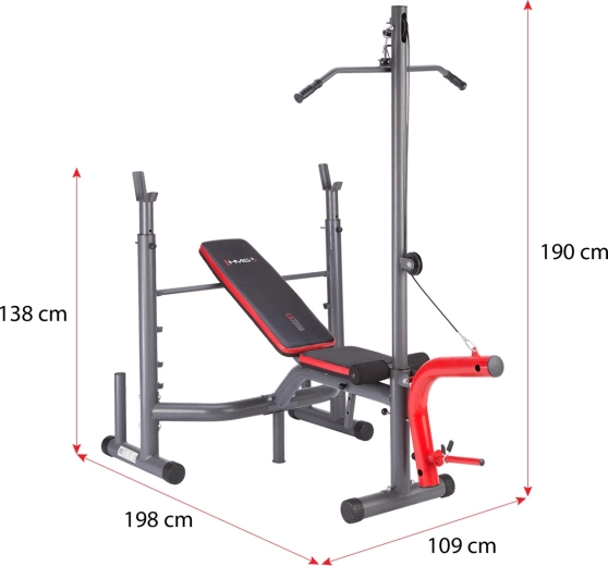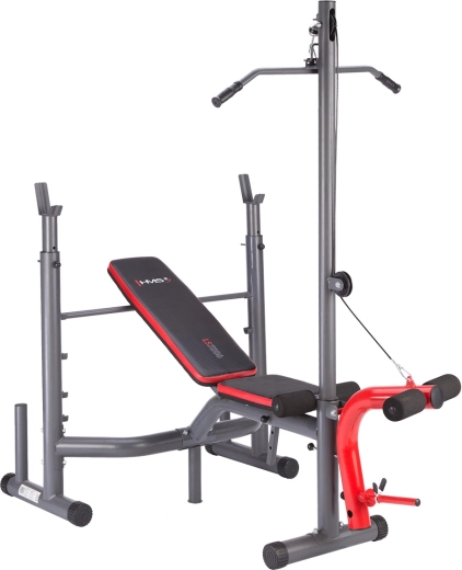 Lavice, stojan na činku, horní kladka, modlitebník i nástavec na nohy – vše pro komplexní trénink horní i dolní části těla bez kompromisů.