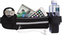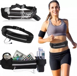 Užijte si volnost pohybu bez batohu. Tento černý běžecký opasek nabízí prostornou hlavní kapsu na zip, do které se vejde telefon, peněženka i drobnosti, a boční kapsu s držákem na láhev pro snadné doplnění tekutin během tréninku. Díky voděodolné polyesterové tkanině zůstanou vaše věci v bezpečí i při horším počasí.