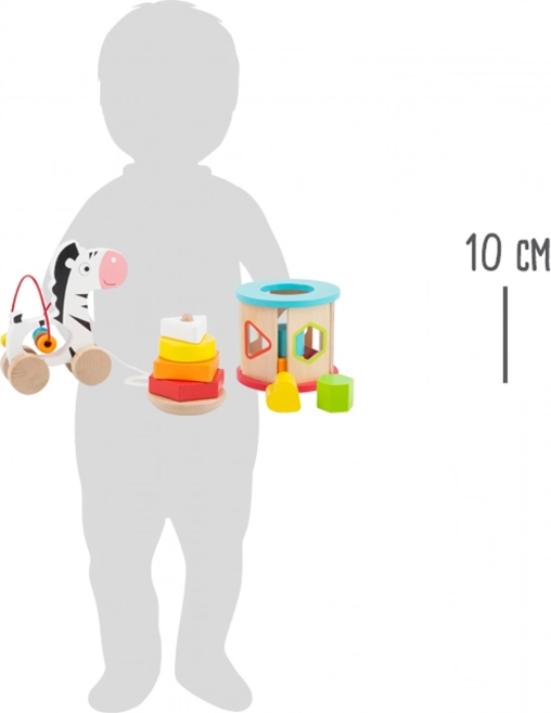 Tato hrací sada je navržena pro nejmenší děti a nabízí rozmanité aktivity, které podporují motorický rozvoj. Každá hračka v sadě je pečlivě vyrobena z dřeva a má atraktivní barevný design, který láká děti ke hře: