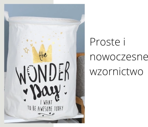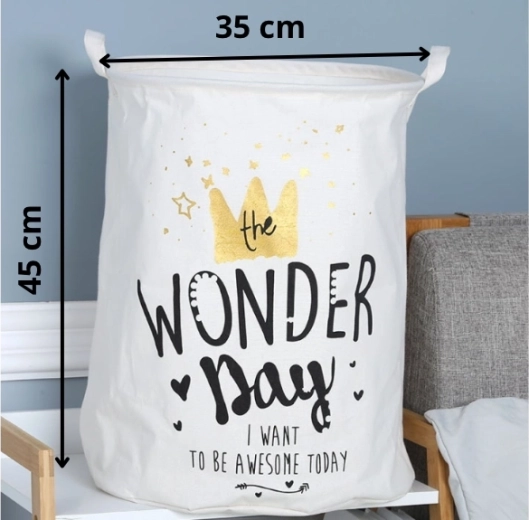 Praktický textilní koš na ukládání o rozměru 45 × 35 cm se stylovým motivem zlaté koruny a nápisem THE WONDER DAY. Díky vnitřní voděodolné vrstvě je vhodný i do koupelny, má pevné a pohodlné úchyty, velkou kapacitu a vyztužený kroužek, který drží tvar.