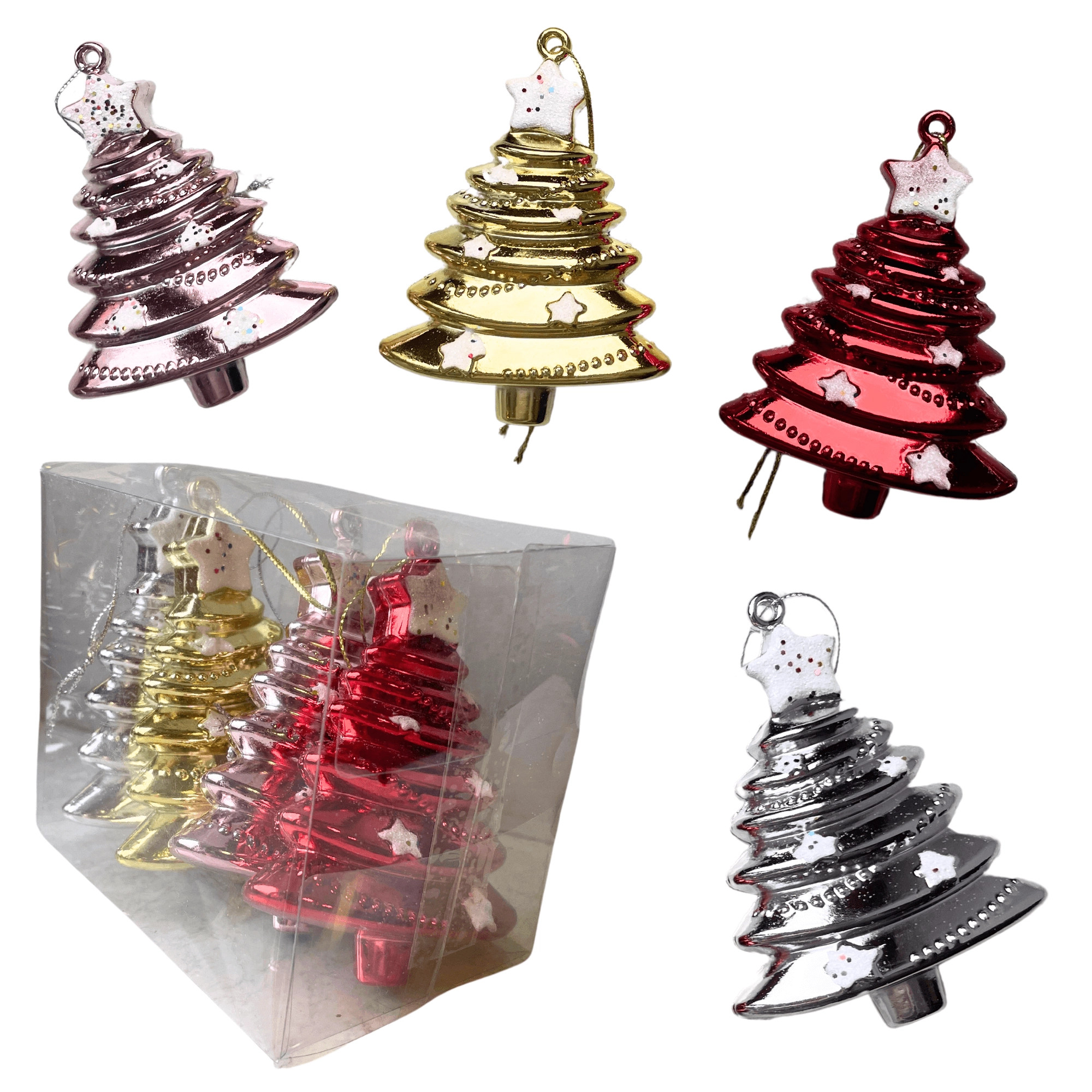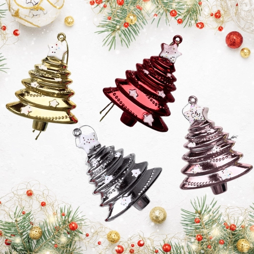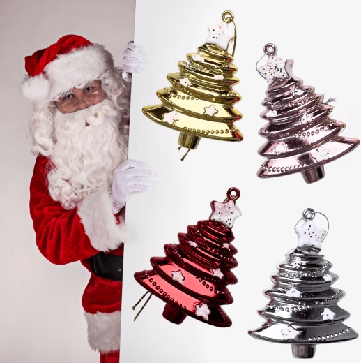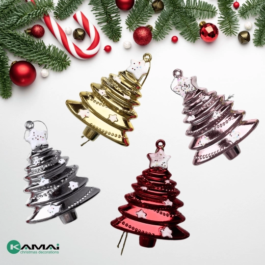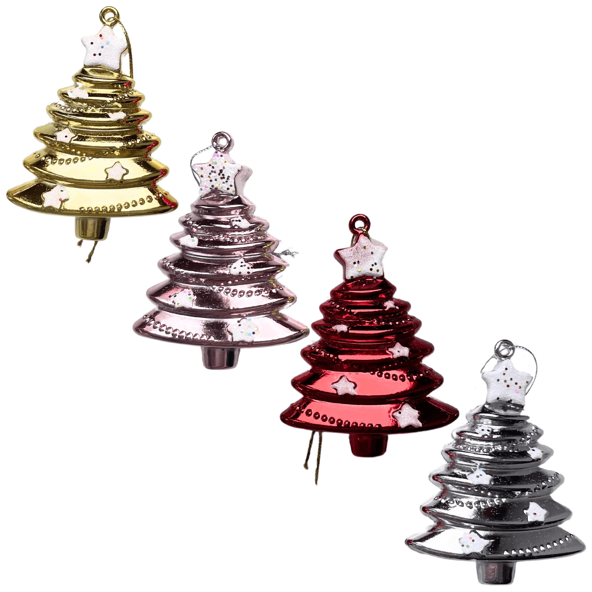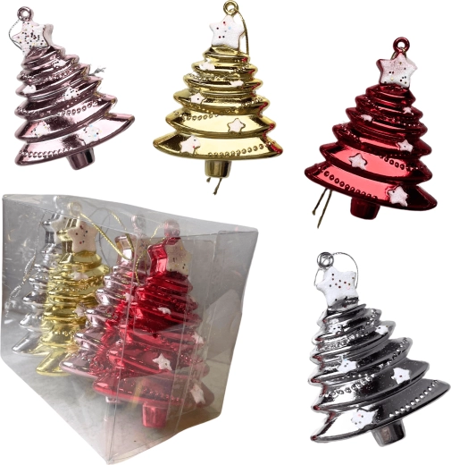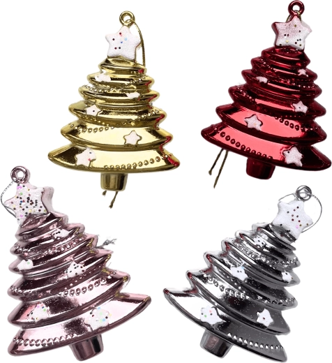 Tato sada 4 kusů stylových ozdob ve tvaru stromku vnese do interiéru i exteriéru okamžitou vánoční atmosféru. Lesklé metalické provedení ve zlaté, červené, růžové a stříbrné barvě odráží světlo a dodává dekoracím efekt jiskření.