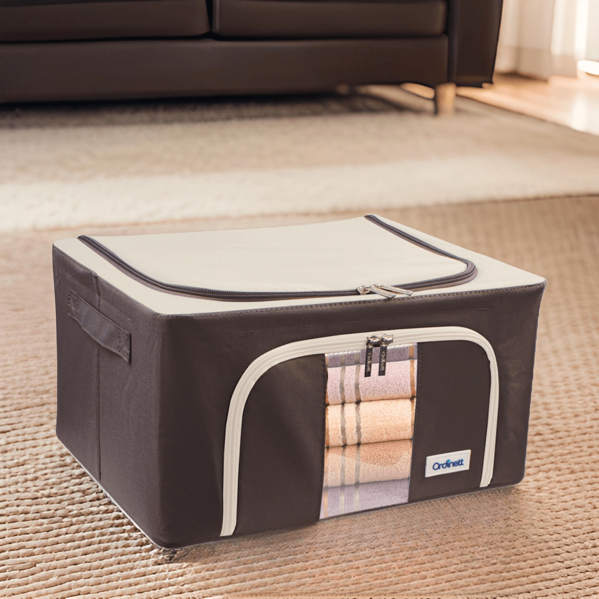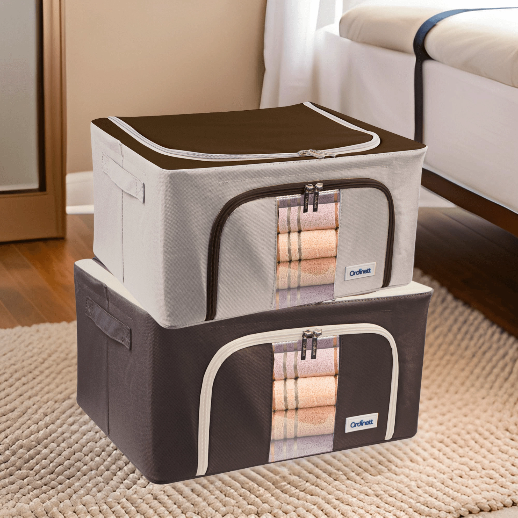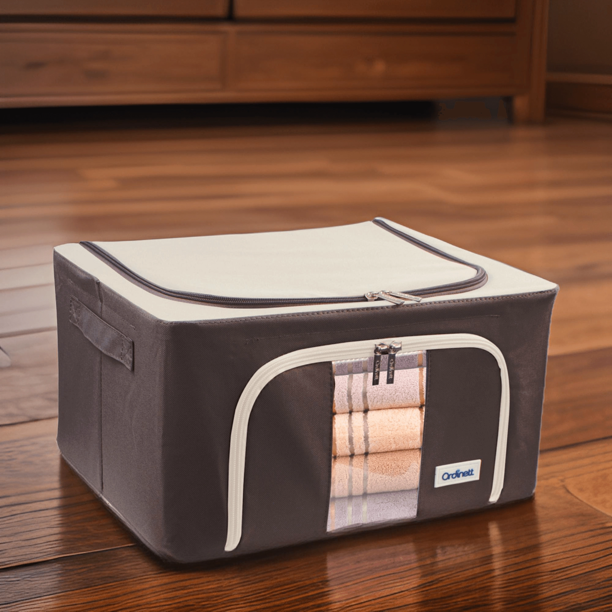Oceníte také dvojité otevírání – horní a přední zip – pro rychlý přístup z police i z podpostele. Boční madla usnadňují manipulaci a přenášení. Nadčasové barevné provedení se hodí do šatny, ložnice, obývacího pokoje i dětského pokoje.
