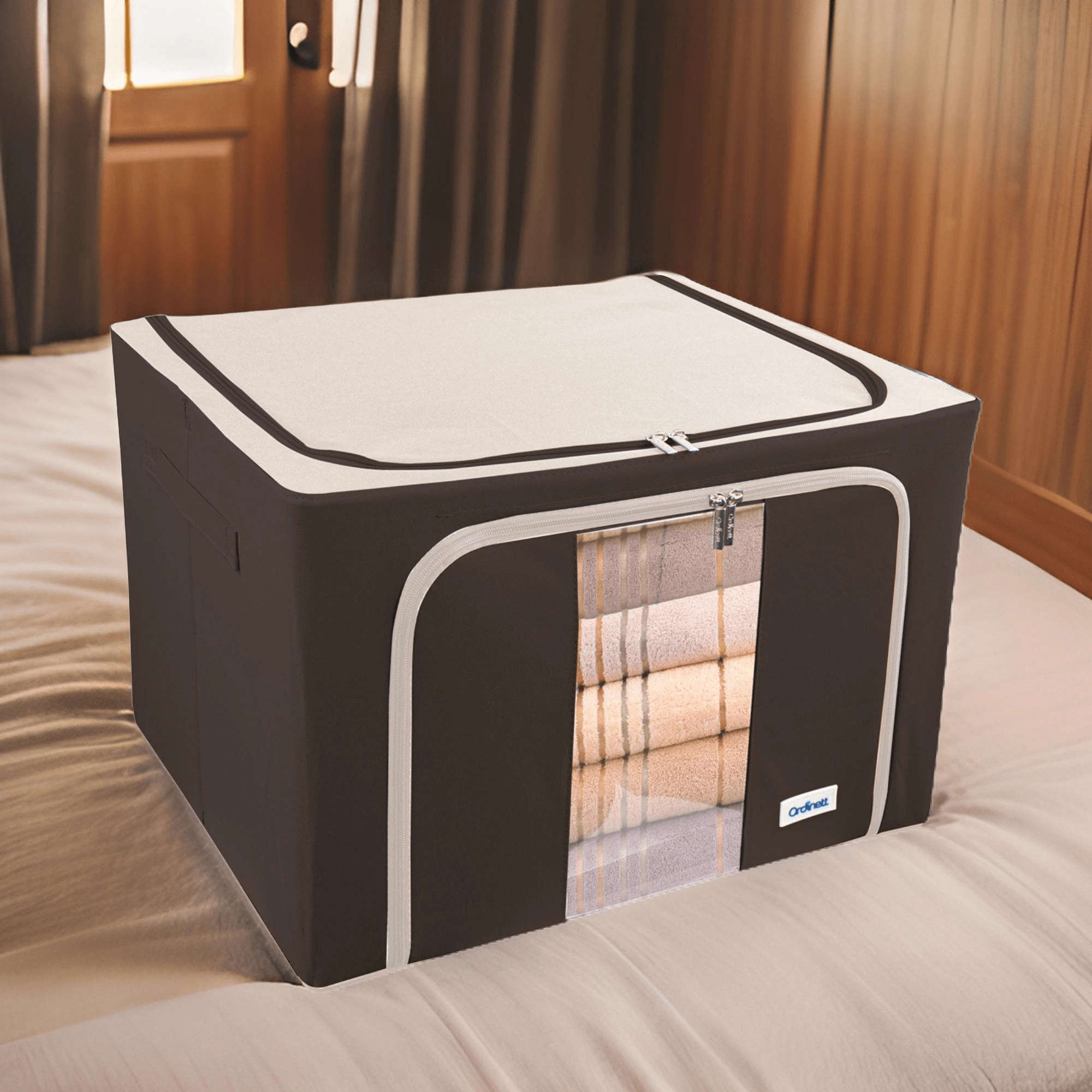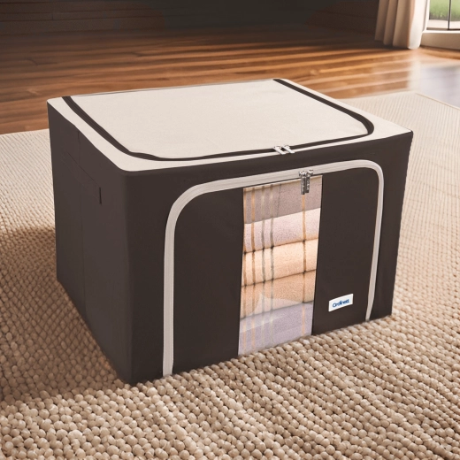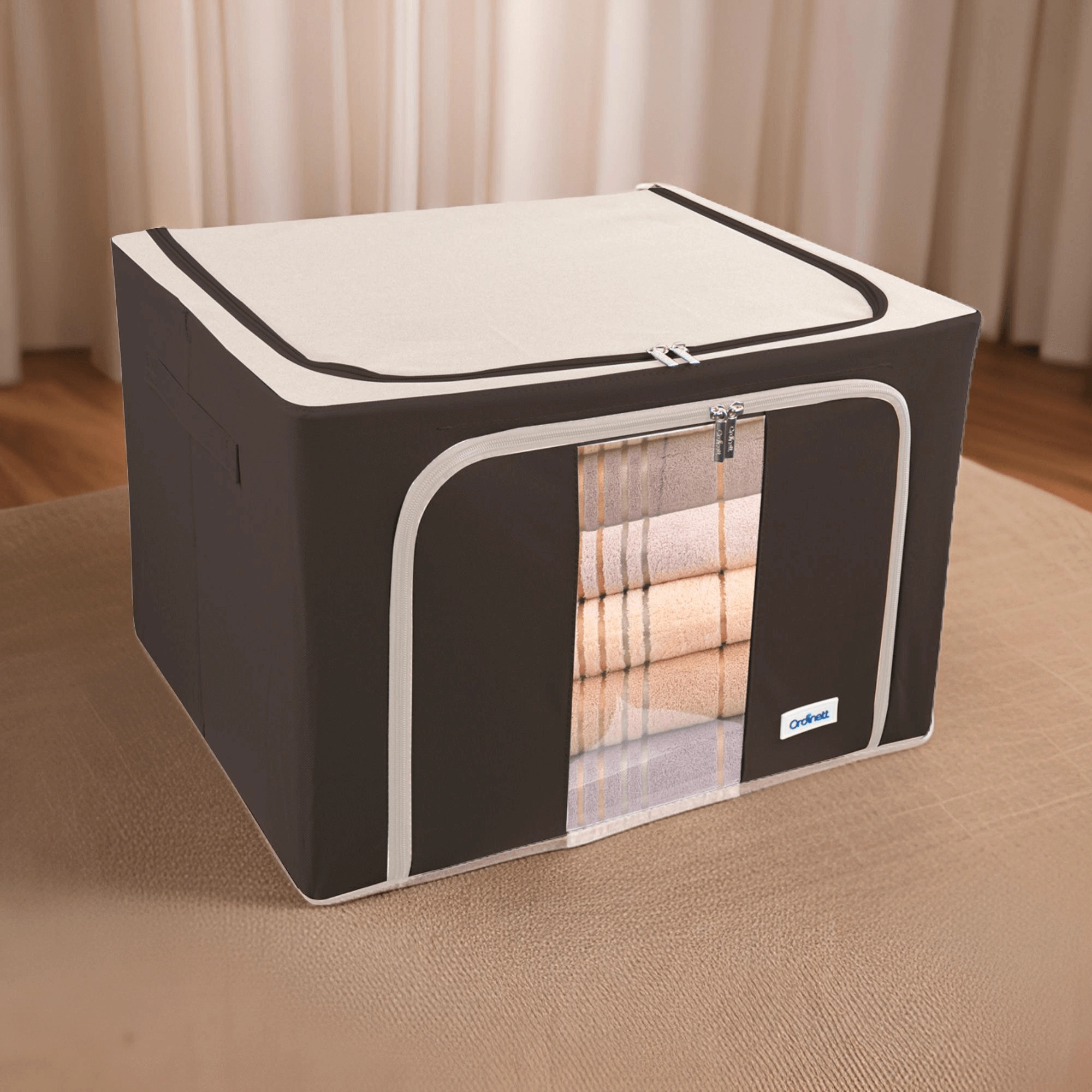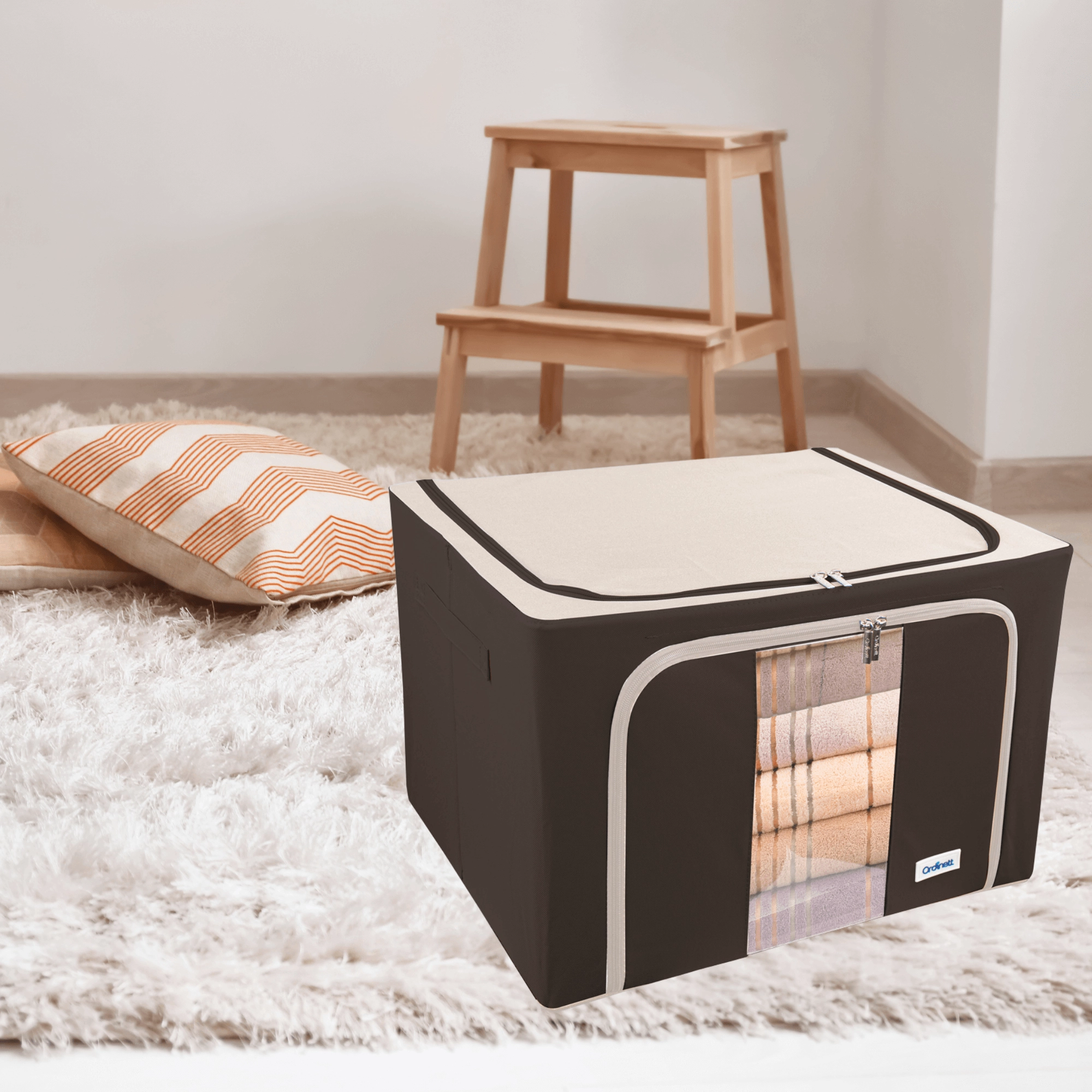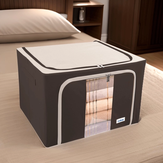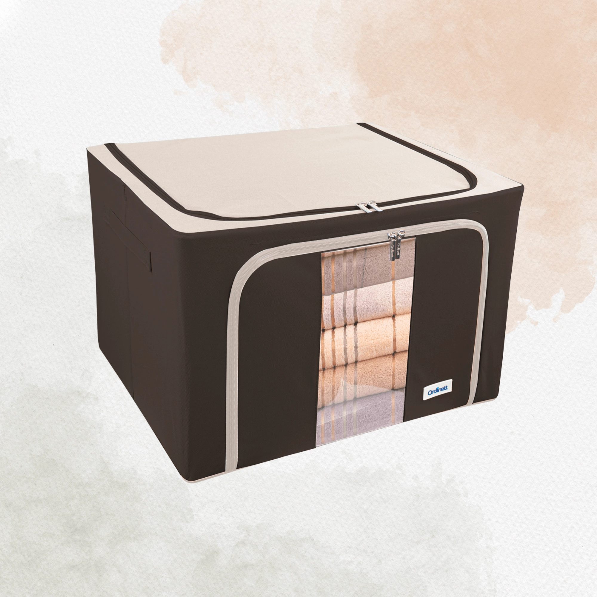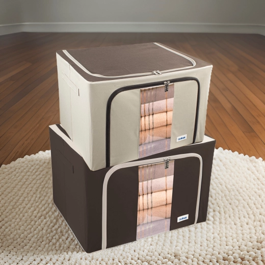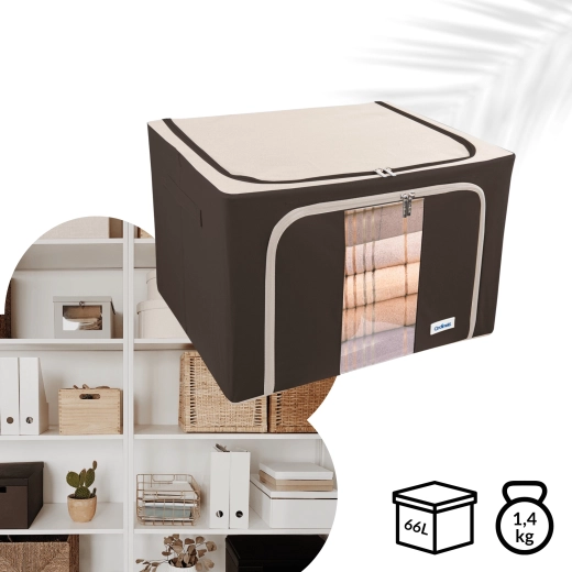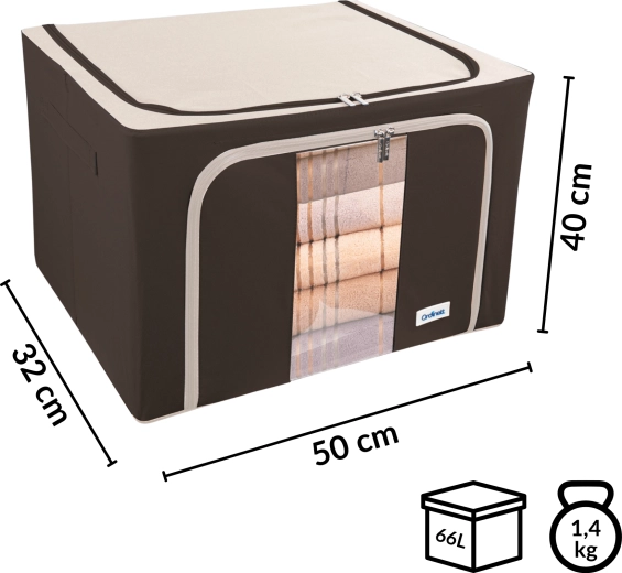 Uložte oblečení, ložní prádlo i sezónní textilie přehledně a bez prachu. Textilní úložný box KAMAI GIO STYLE s objemem 66 litrů nabízí pevnou konstrukci, průhledné okénko a promyšlené otvory na zipu pro pohodlný přístup shora i zepředu. Skvěle se hodí do skříní, na police i pod postel.