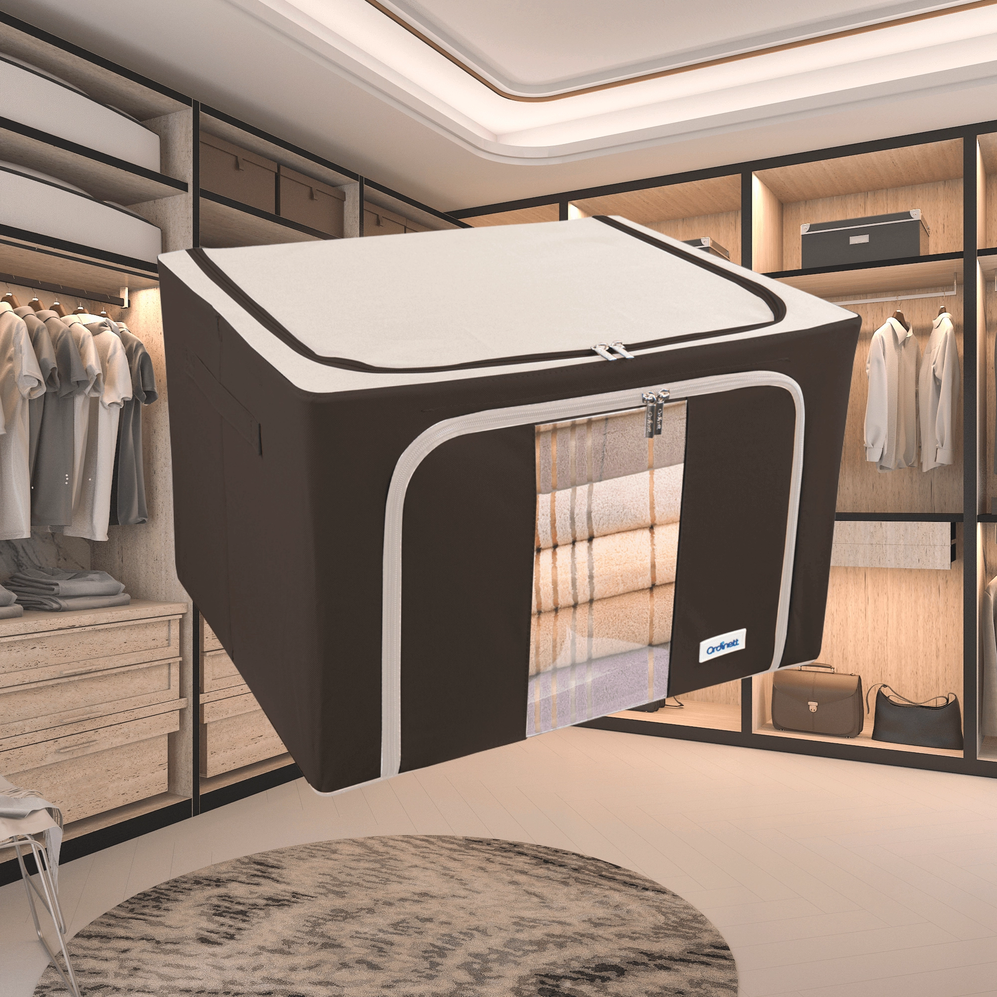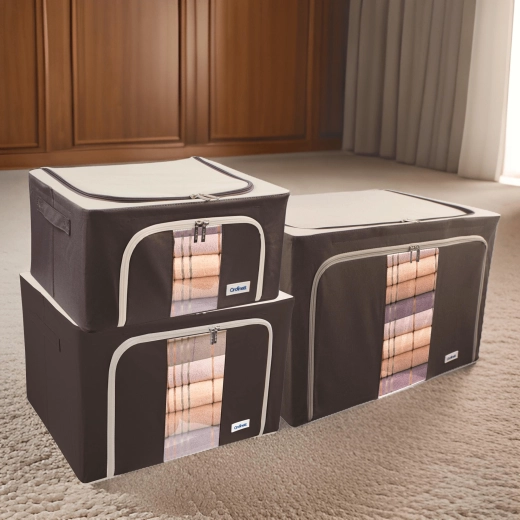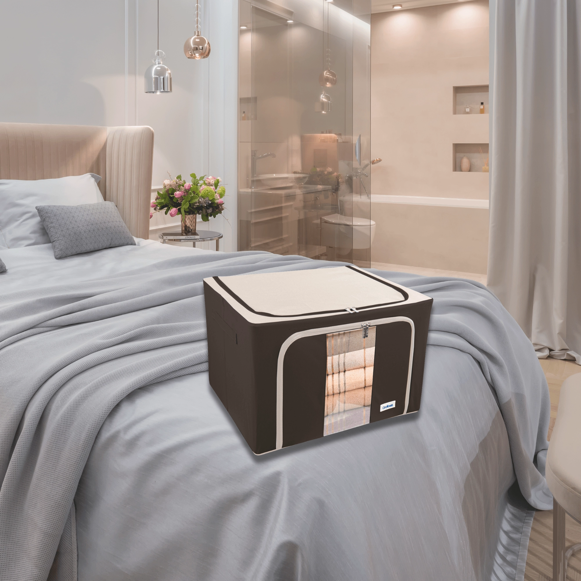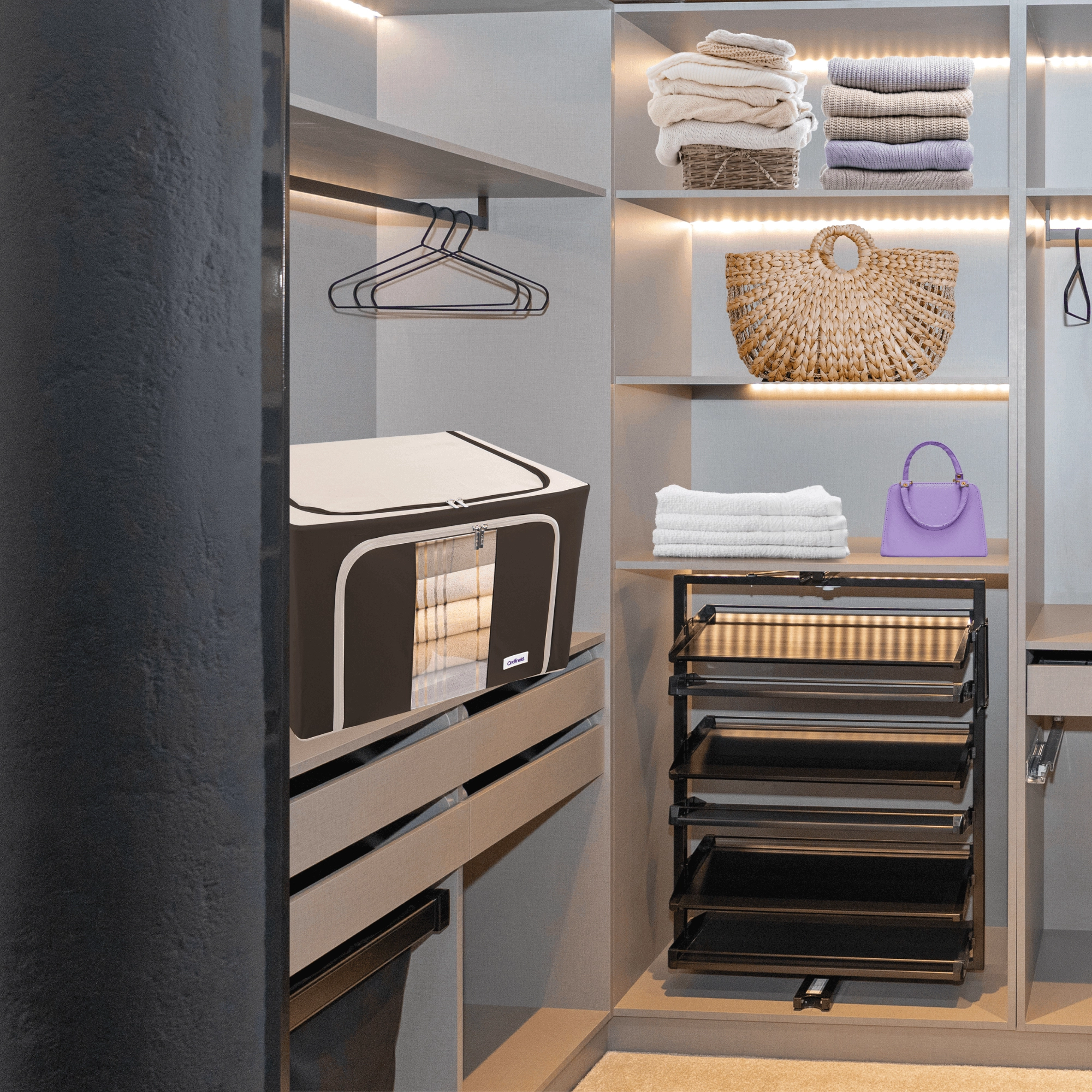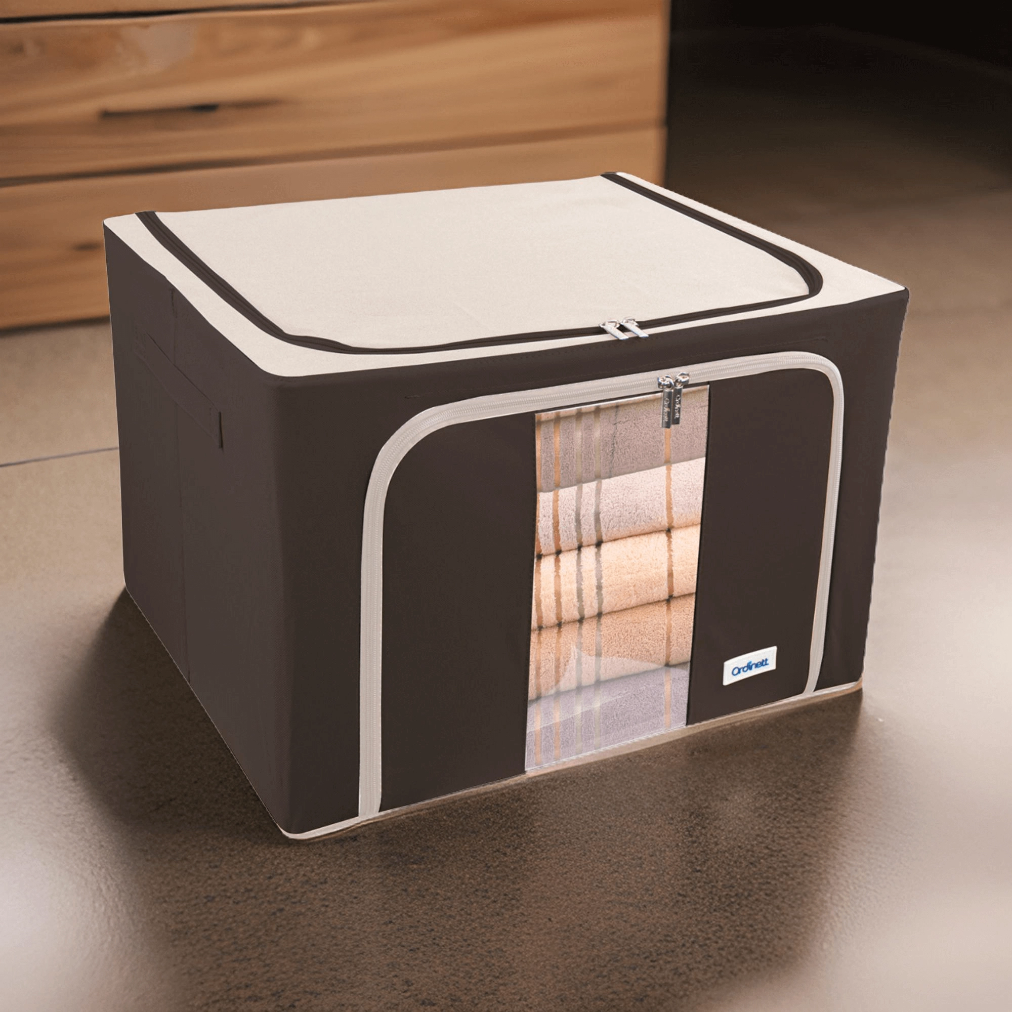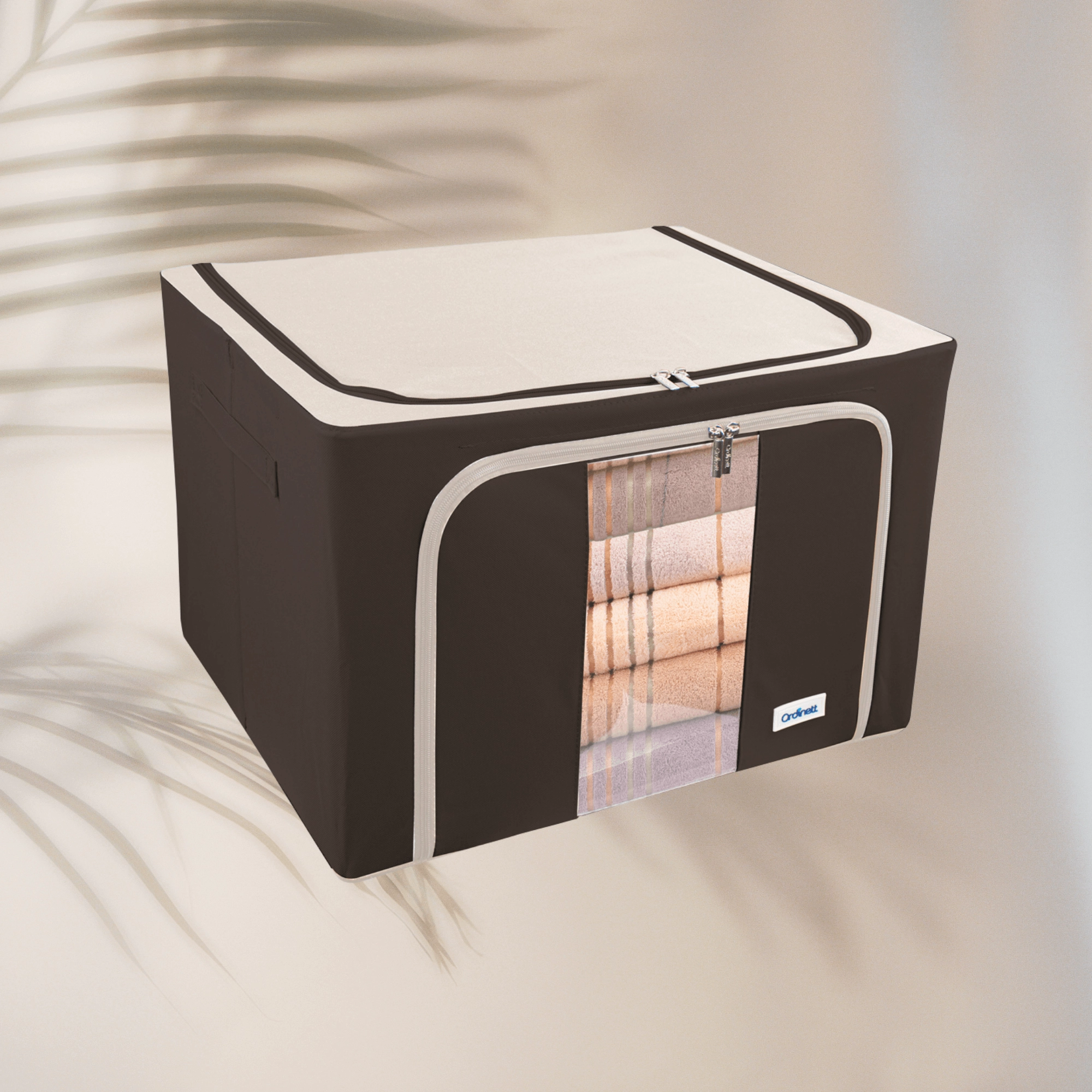 Uložte oblečení, ložní prádlo i sezónní textilie přehledně a bez prachu. Textilní úložný box KAMAI GIO STYLE s objemem 66 litrů nabízí pevnou konstrukci, průhledné okénko a promyšlené otvory na zipu pro pohodlný přístup shora i zepředu. Skvěle se hodí do skříní, na police i pod postel.