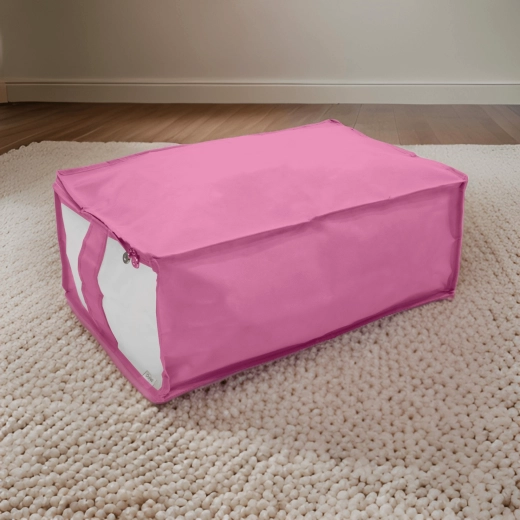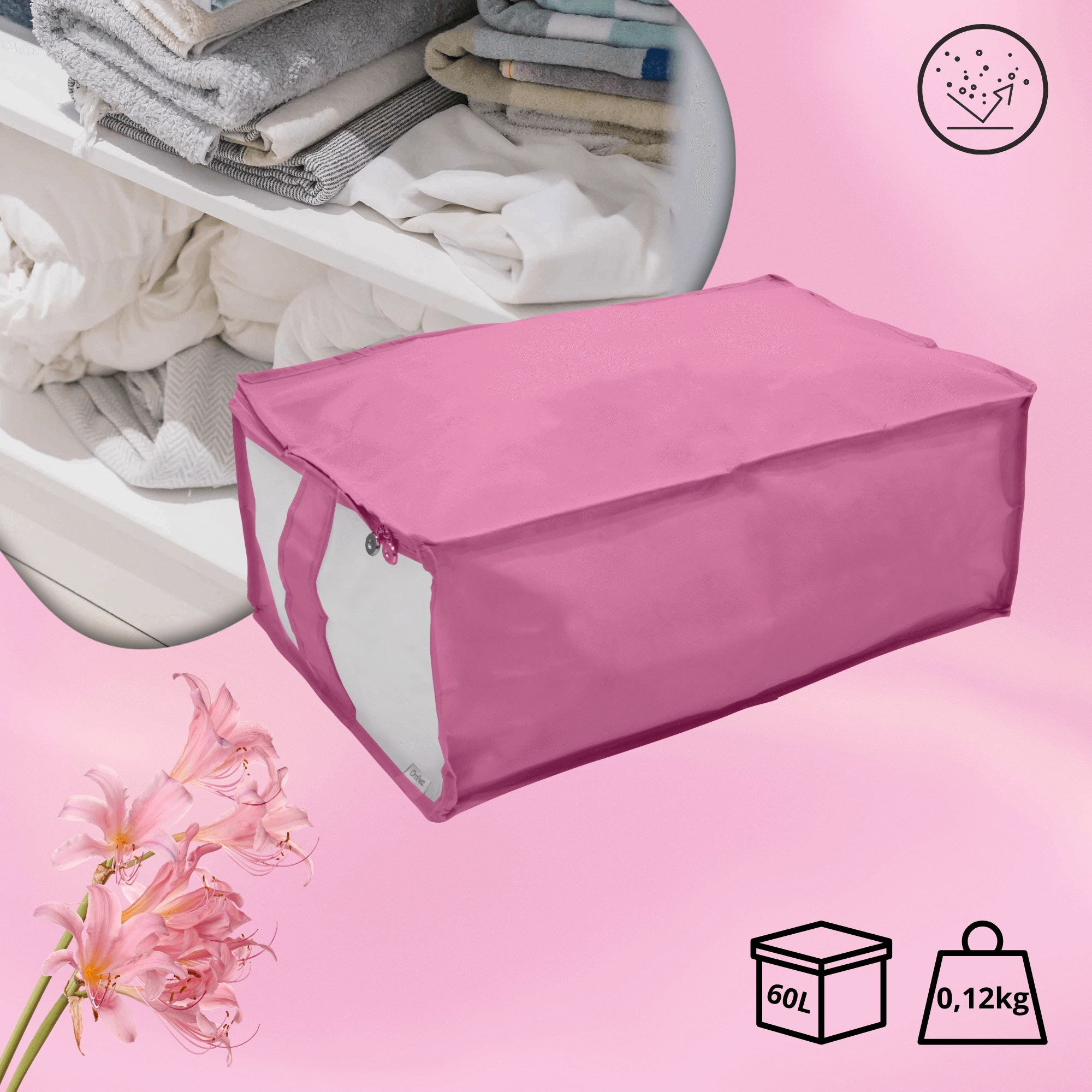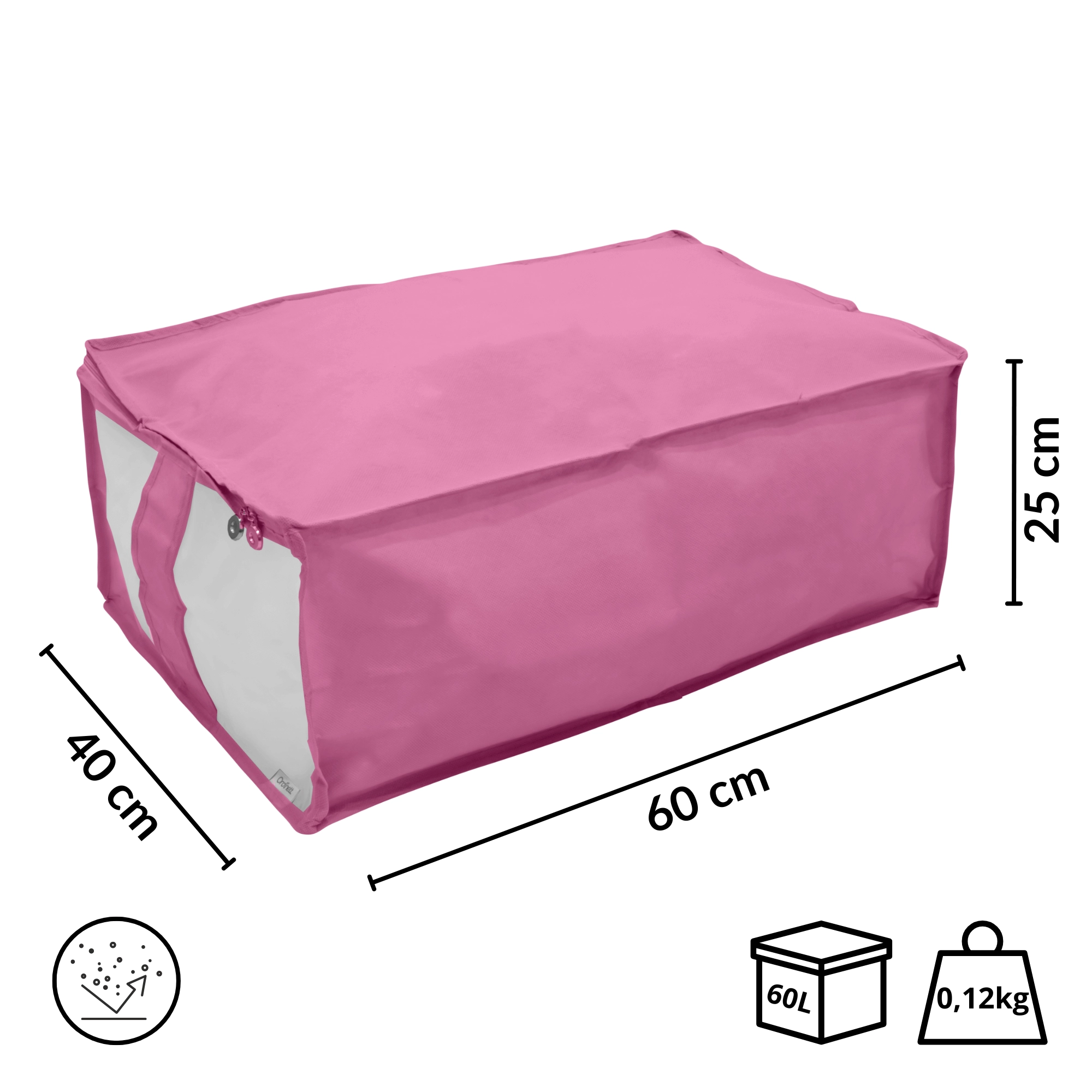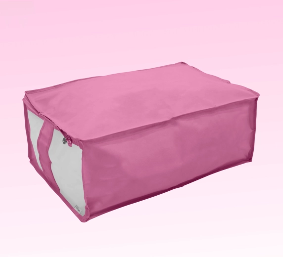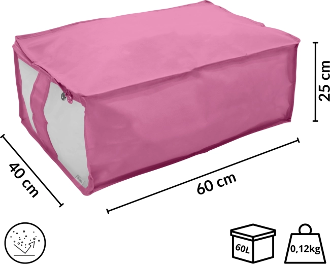 Box je vyroben z pevné a lehké netkané textilie, která se snadno přenáší a dobře drží tvar. Zip po obvodu usnadňuje plnění i vyjímání věcí, ať už ukládáte peřiny, povlečení, zimní bundy nebo dětské hračky.
