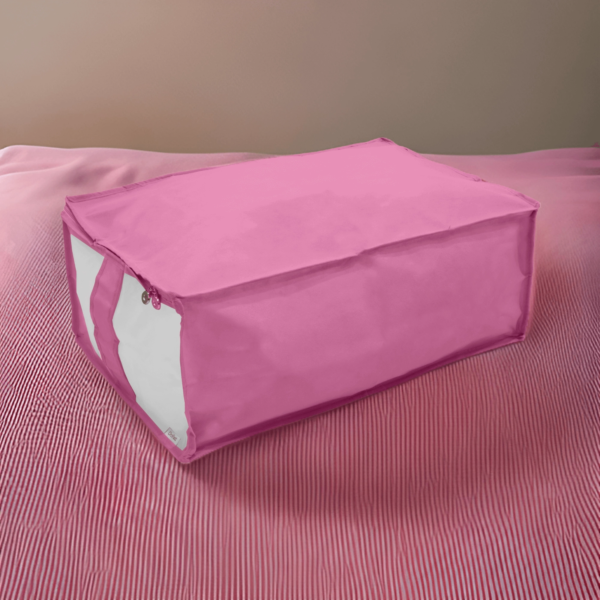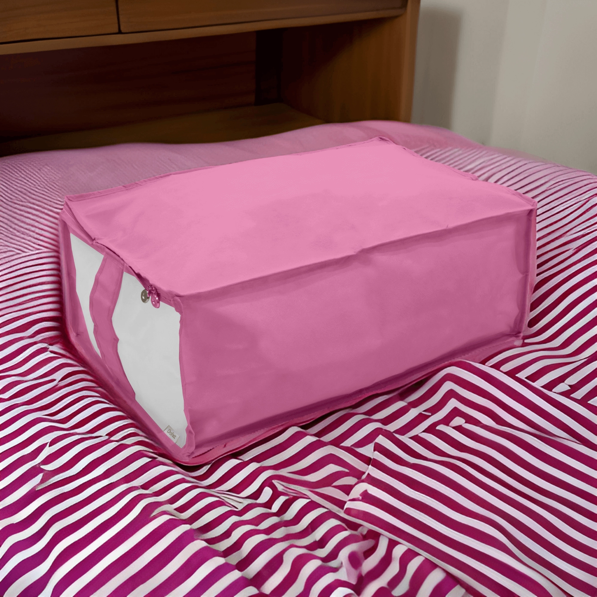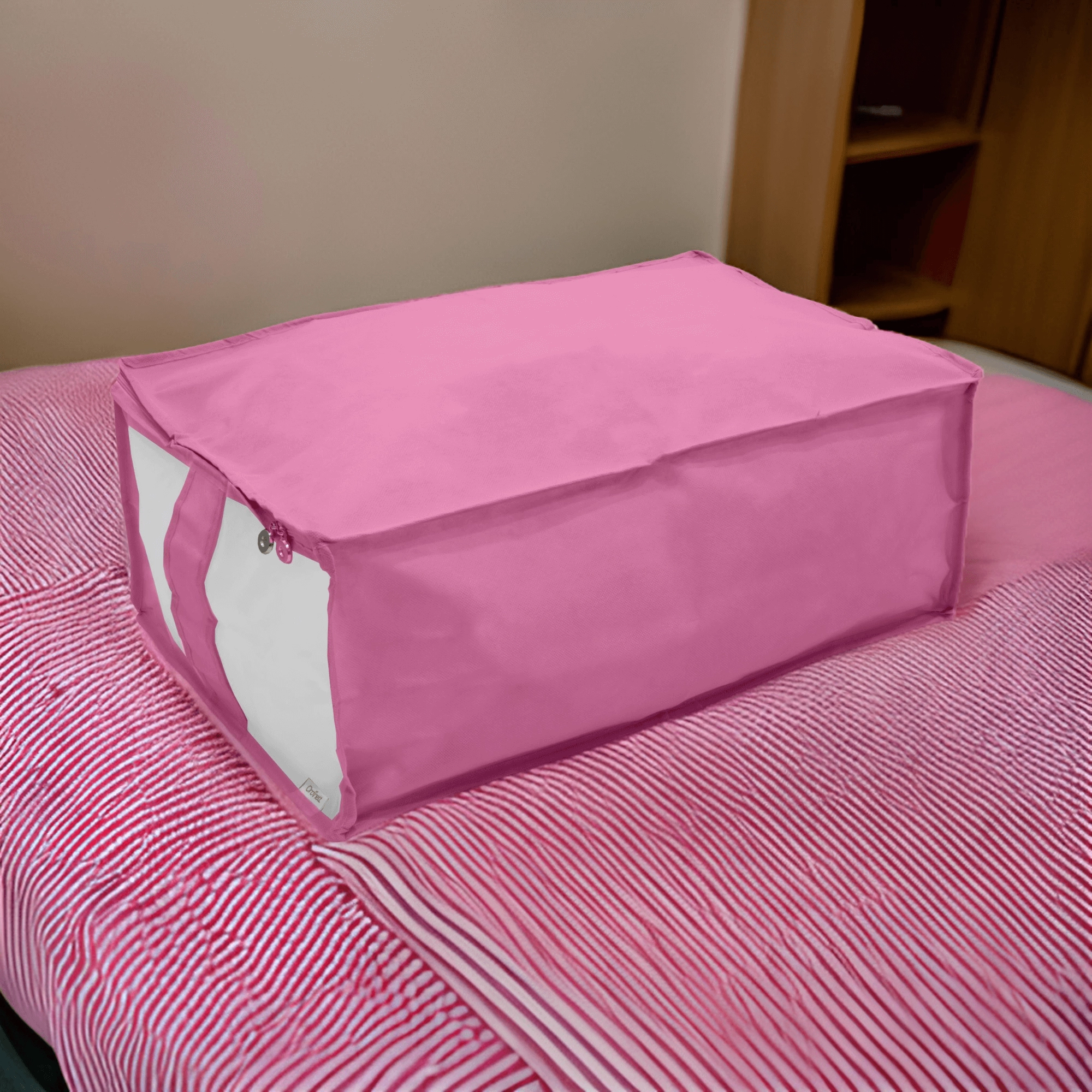 Box je vyroben z pevné a lehké netkané textilie, která se snadno přenáší a dobře drží tvar. Zip po obvodu usnadňuje plnění i vyjímání věcí, ať už ukládáte peřiny, povlečení, zimní bundy nebo dětské hračky.
