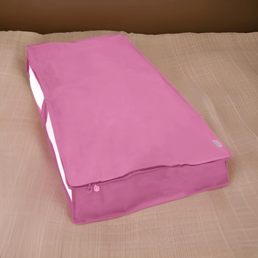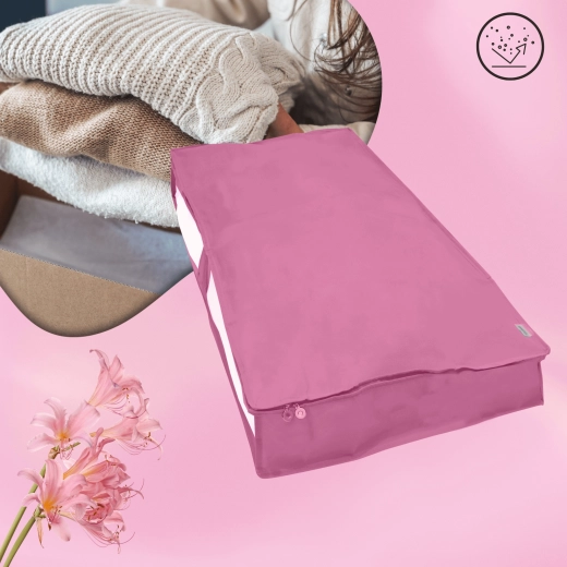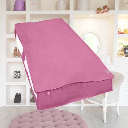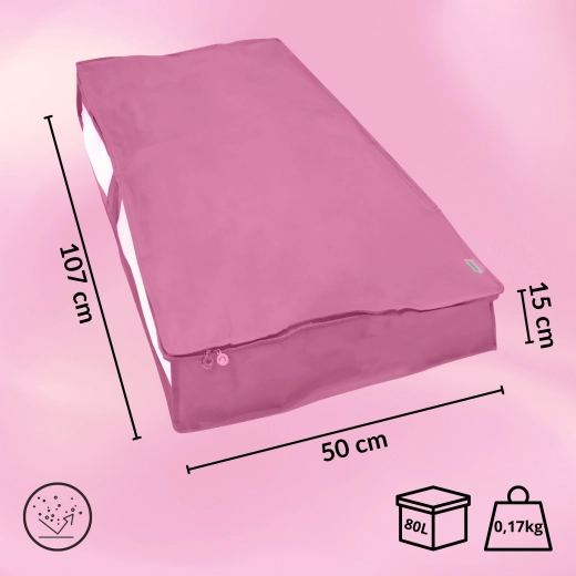 Chytré využití prostoru pod postelí nebo na horních policích skříně. Růžový organizér BLOSSOM v rozměru 107 × 50 × 15 cm nabízí dostatek místa pro peřiny, polštáře, povlečení, zimní kabáty či dětské hračky. Díky průhlednému okénku vždy rychle poznáte, co je uvnitř.
