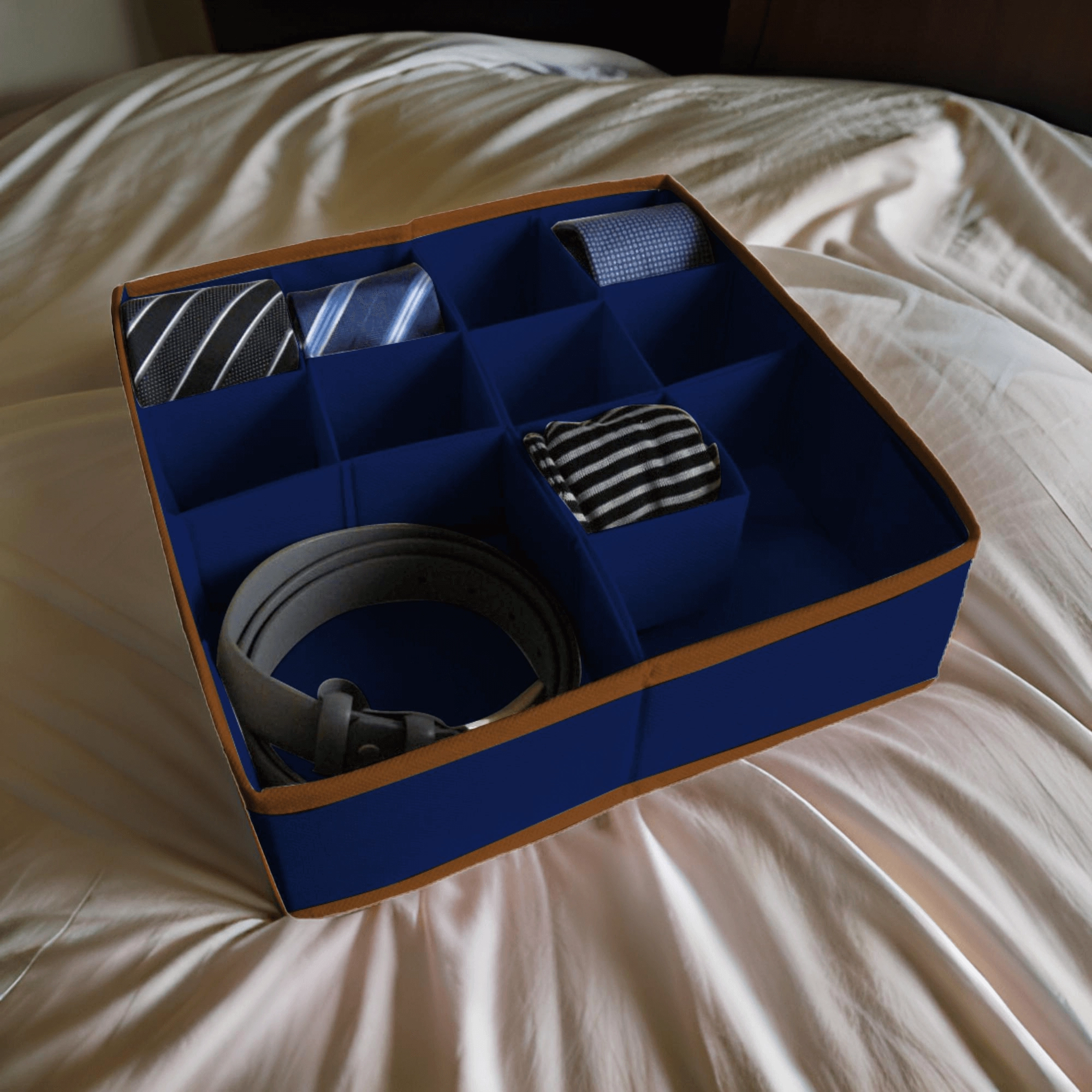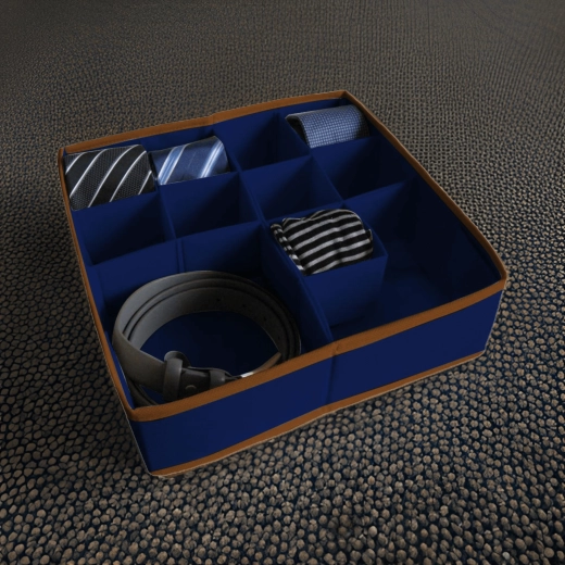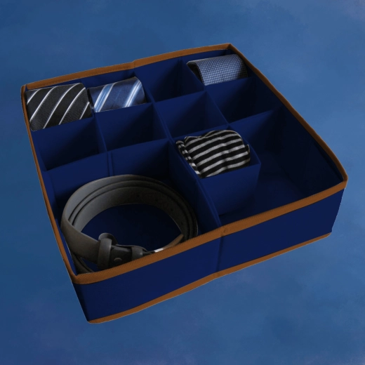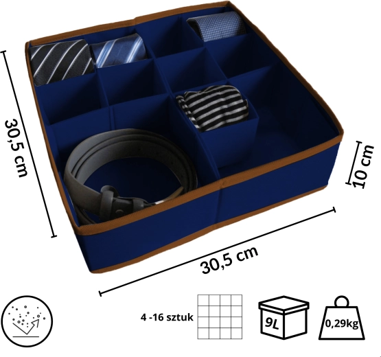 Praktický organizér o rozměrech 30,5 × 30,5 × 10 cm promění chaos v přehledný systém. Měkká, ale pevná netkaná textilie se snadno udržuje a drží tvar, takže drobné kusy oblečení i doplňky zůstanou pěkně na místě. Neutrální, tmavě modrá barva s decentním lemem ladí s každou skříní i komodou.