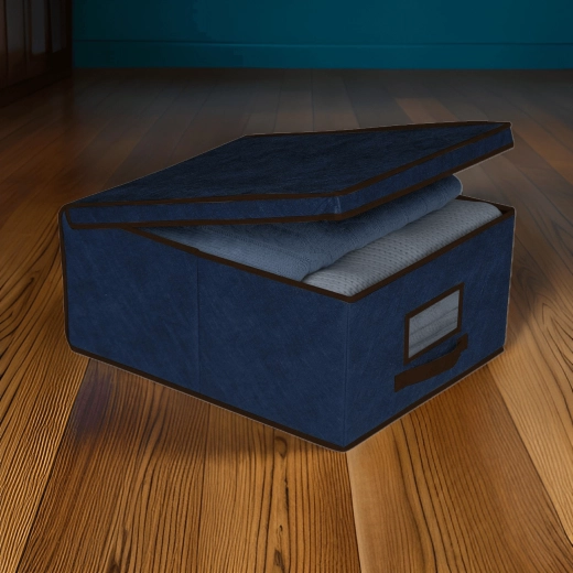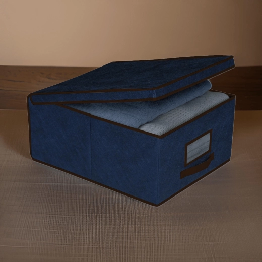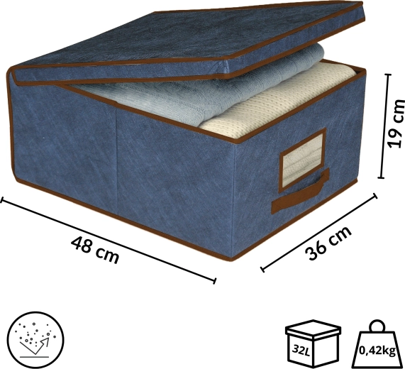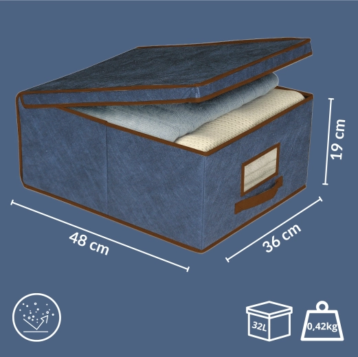 Modrý úložný box o rozměrech 48 × 36 × 19 cm je vyroben z odolné netkané textilie, která je lehká, vzdušná a snadno se udržuje. Integrované víko drží tvar, chrání před prachem a udržuje uložené věci čisté. Čelní průhledné okénko a štítek usnadní rychlou identifikaci obsahu bez otevírání.