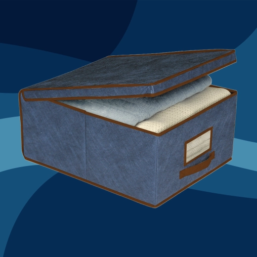 Díky pevnému přednímu madlu box snadno vysunete z police či horní příčky skříně. Je ideální pro skladování sezónního oblečení, ložního prádla, dek, svetrů, hraček i doplňků. Elegantní tmavě modrá barva s decentním lemováním se hodí do každého interiéru.