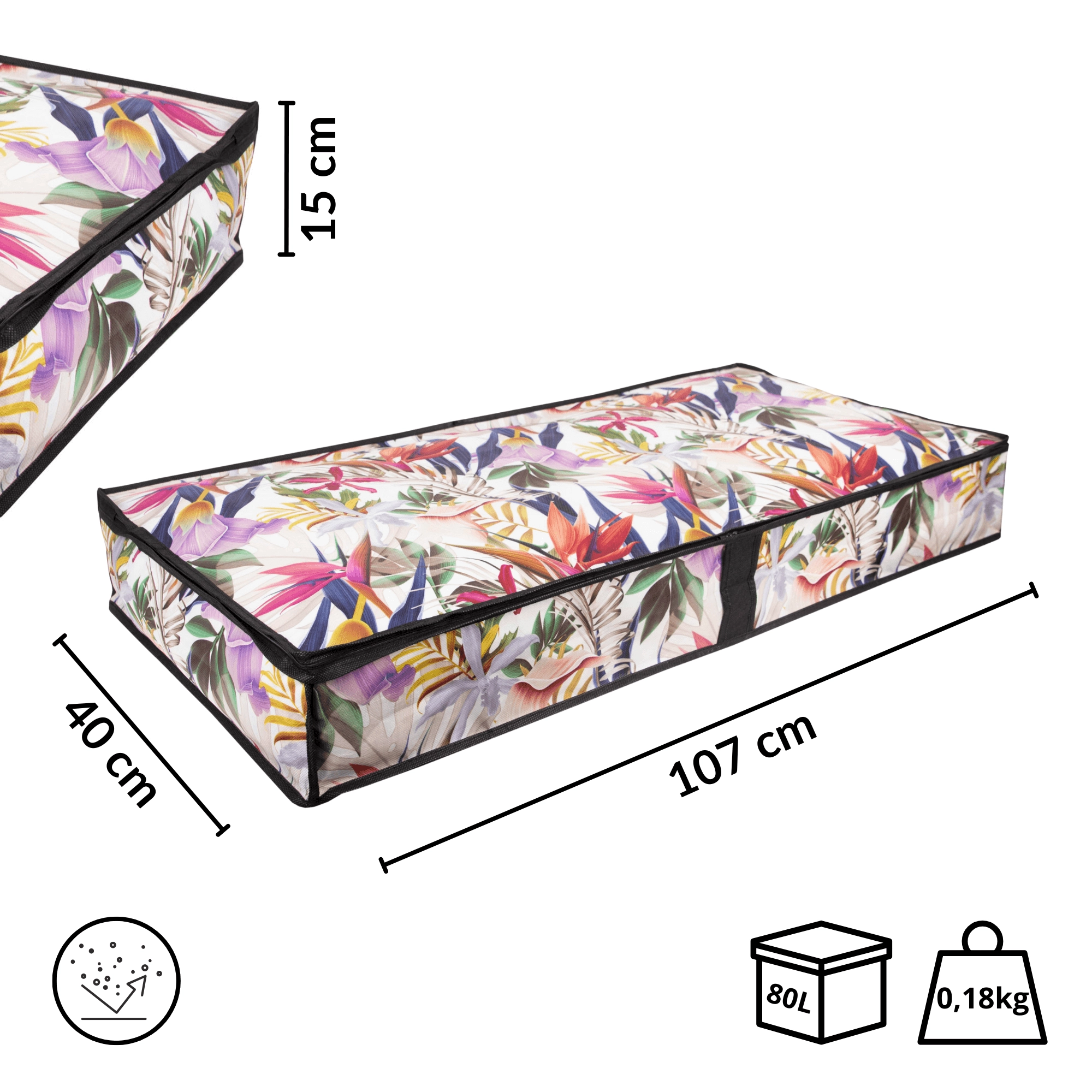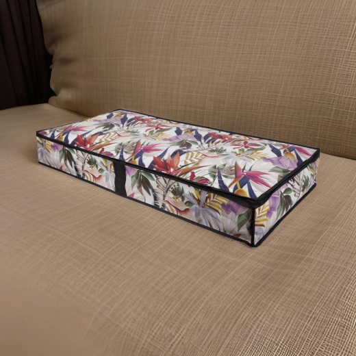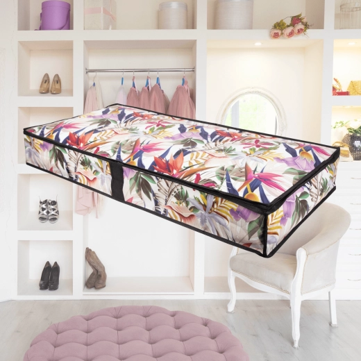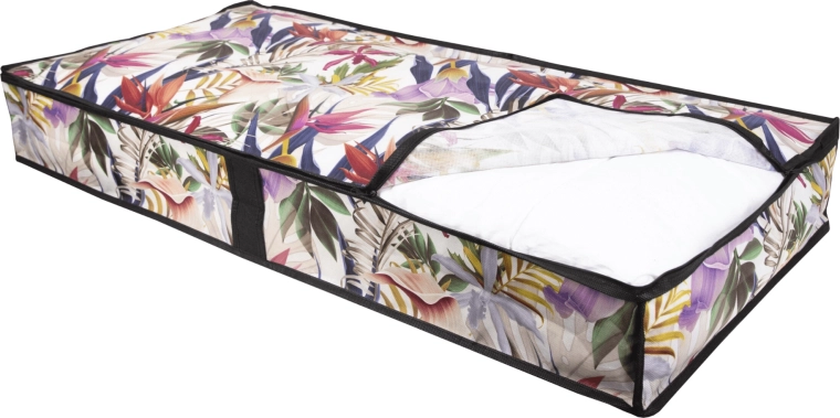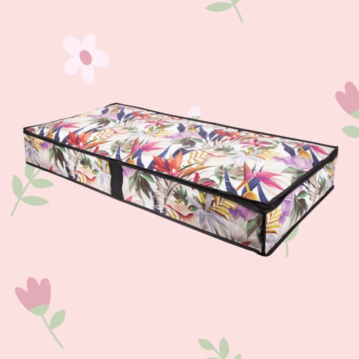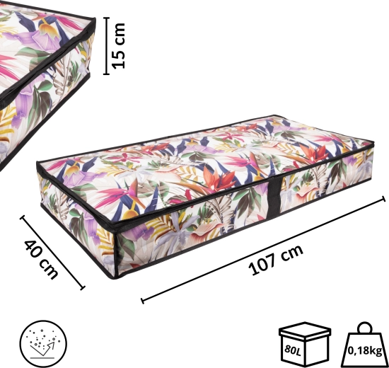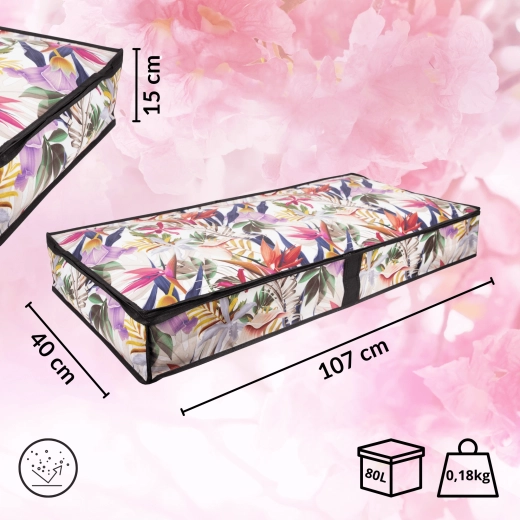 Vytěžte maximum z každého centimetru. Nízký profil úložného boxu o rozměrech 107 × 50 × 15 cm se hladce zasune pod postel nebo na skříňovou polici a udrží vaše textilie přehledně uspořádané a chráněné před prachem. Květinový potisk dodá interiéru svěží a stylový akcent.