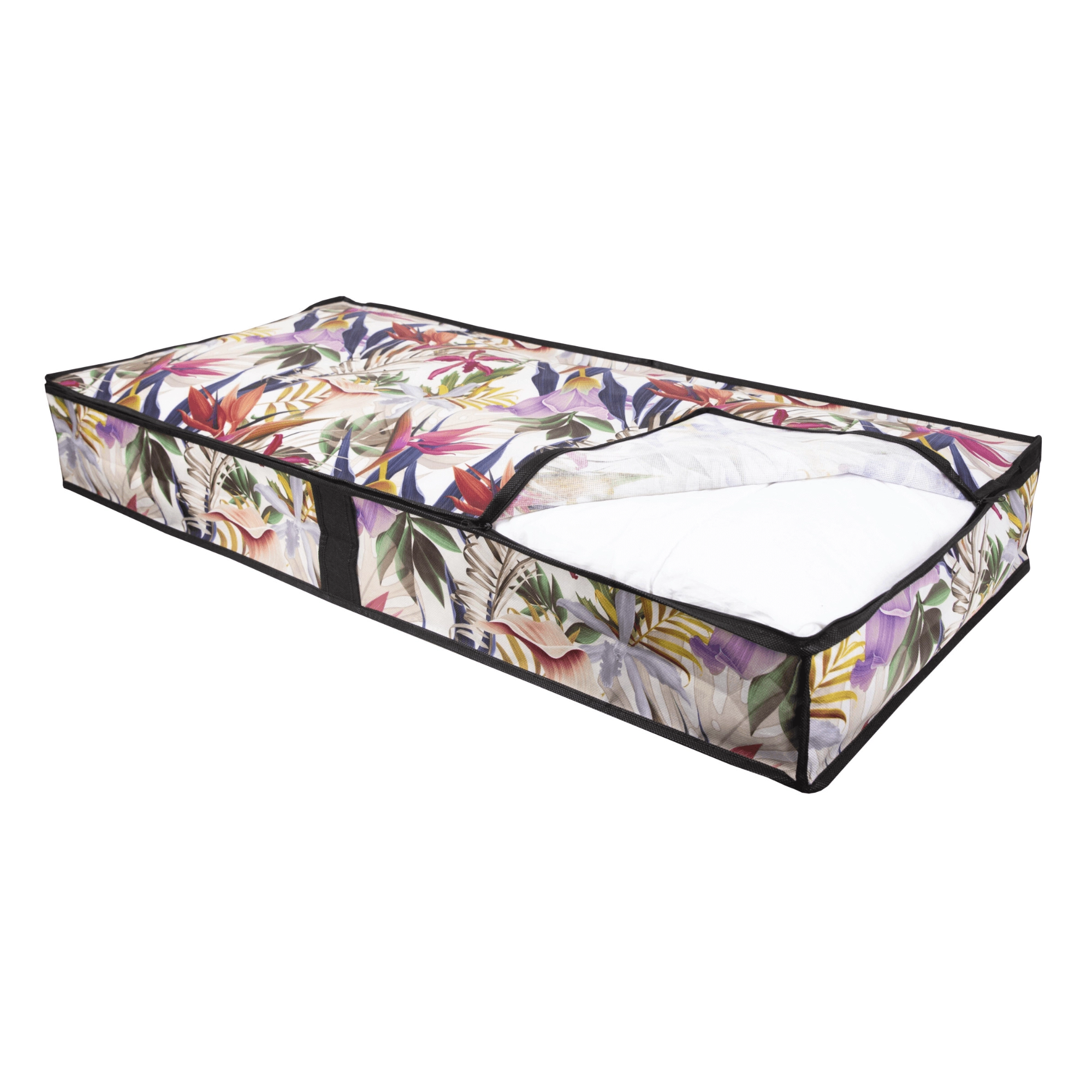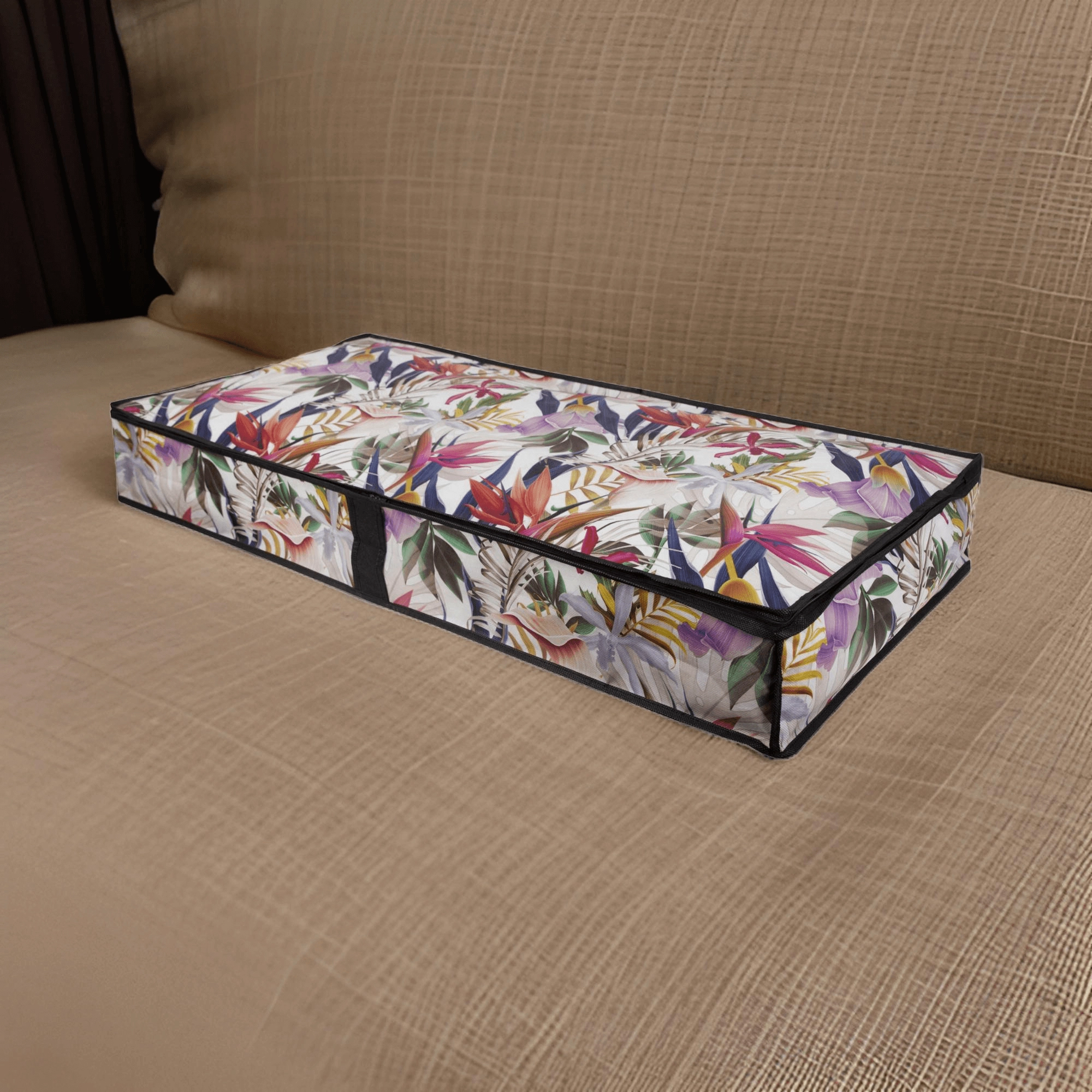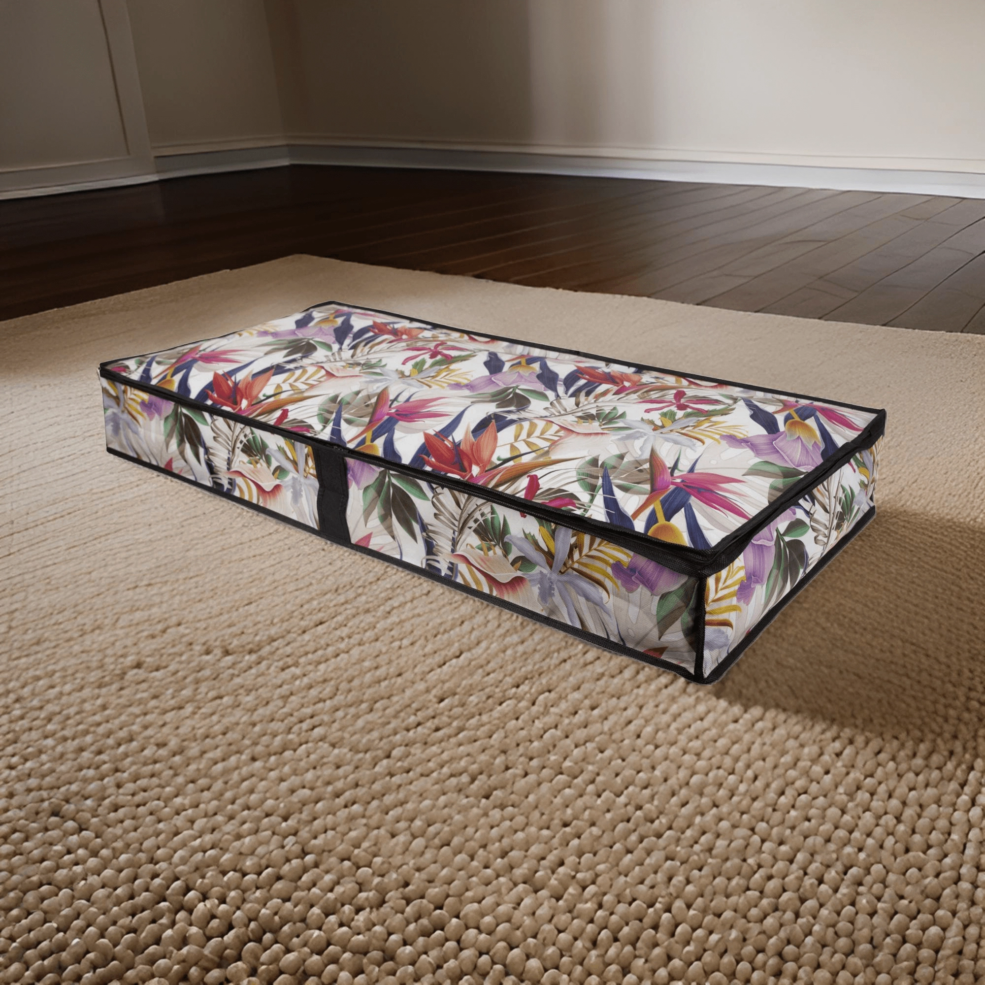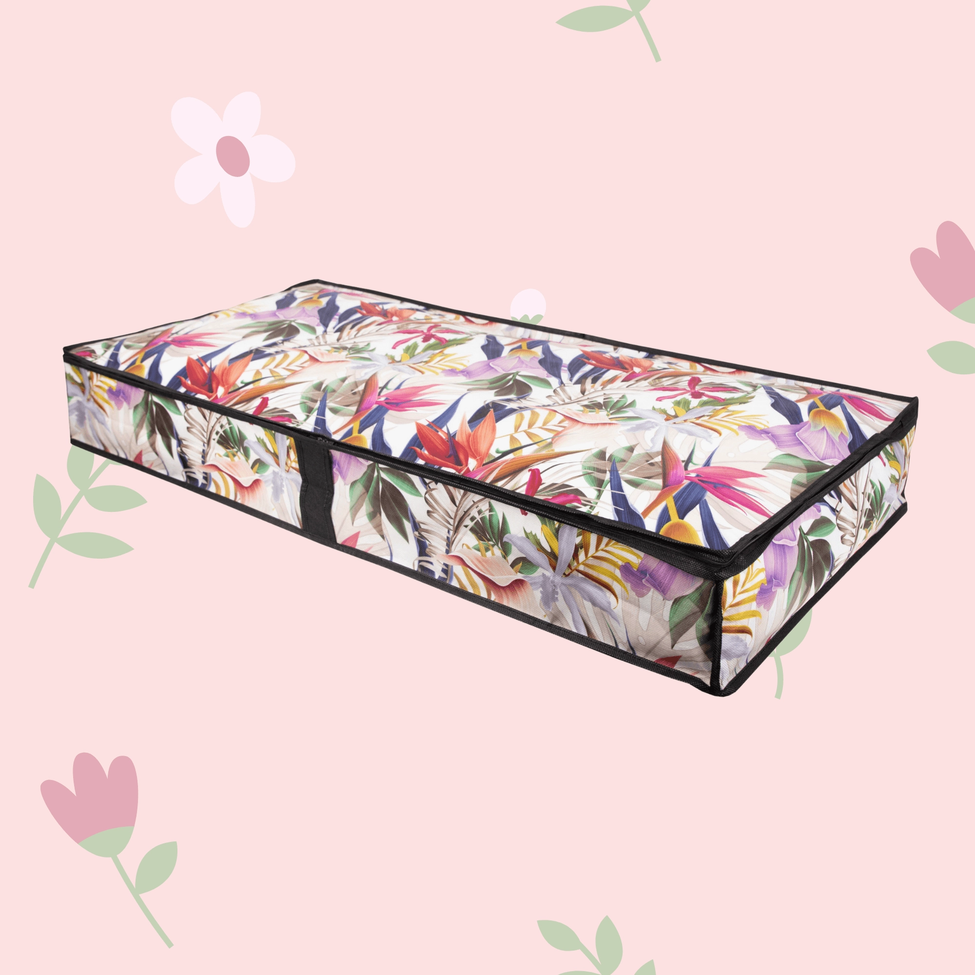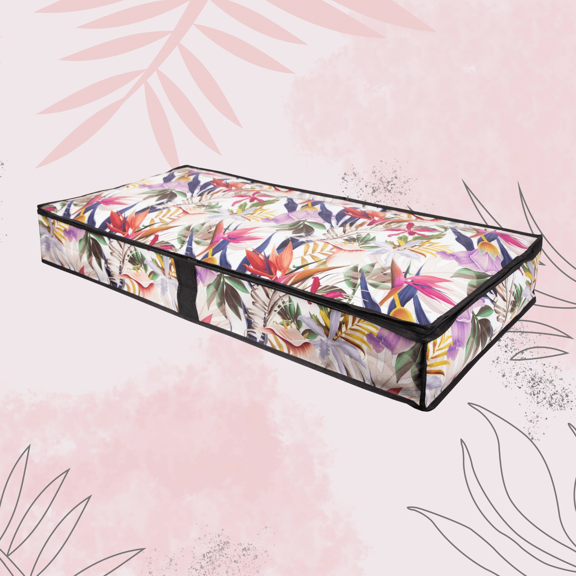 Elegantní textilní úložný box s květinovým motivem je ideální pro ukládání oblečení, dek a ložního prádla. Díky obvodovému zipu a bočnímu uchu máte ke všemu rychlý přístup, zatímco pevný netkaný PET materiál chrání obsah před prachem a pomáhá šetřit místo pod postelí i v šatní skříni.