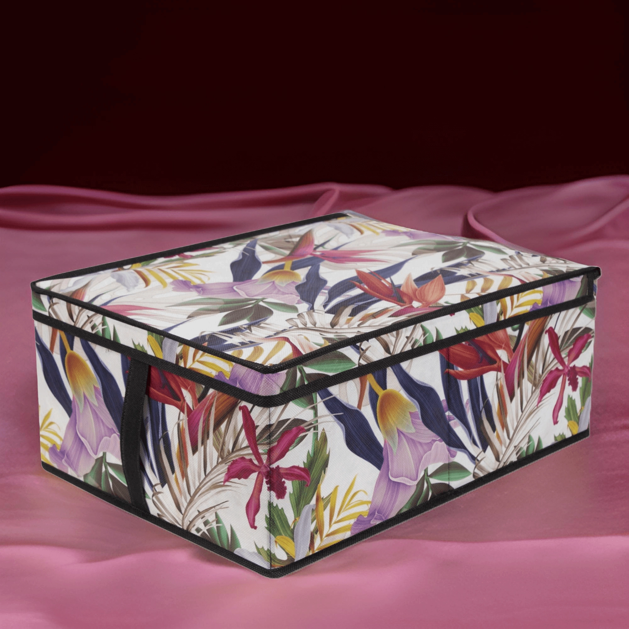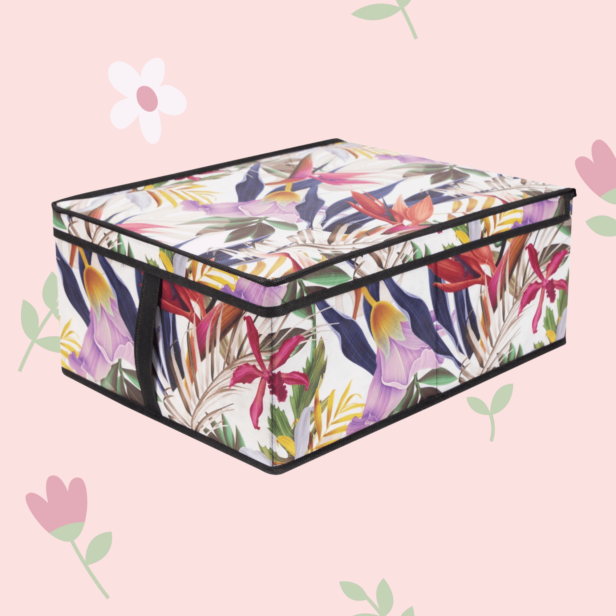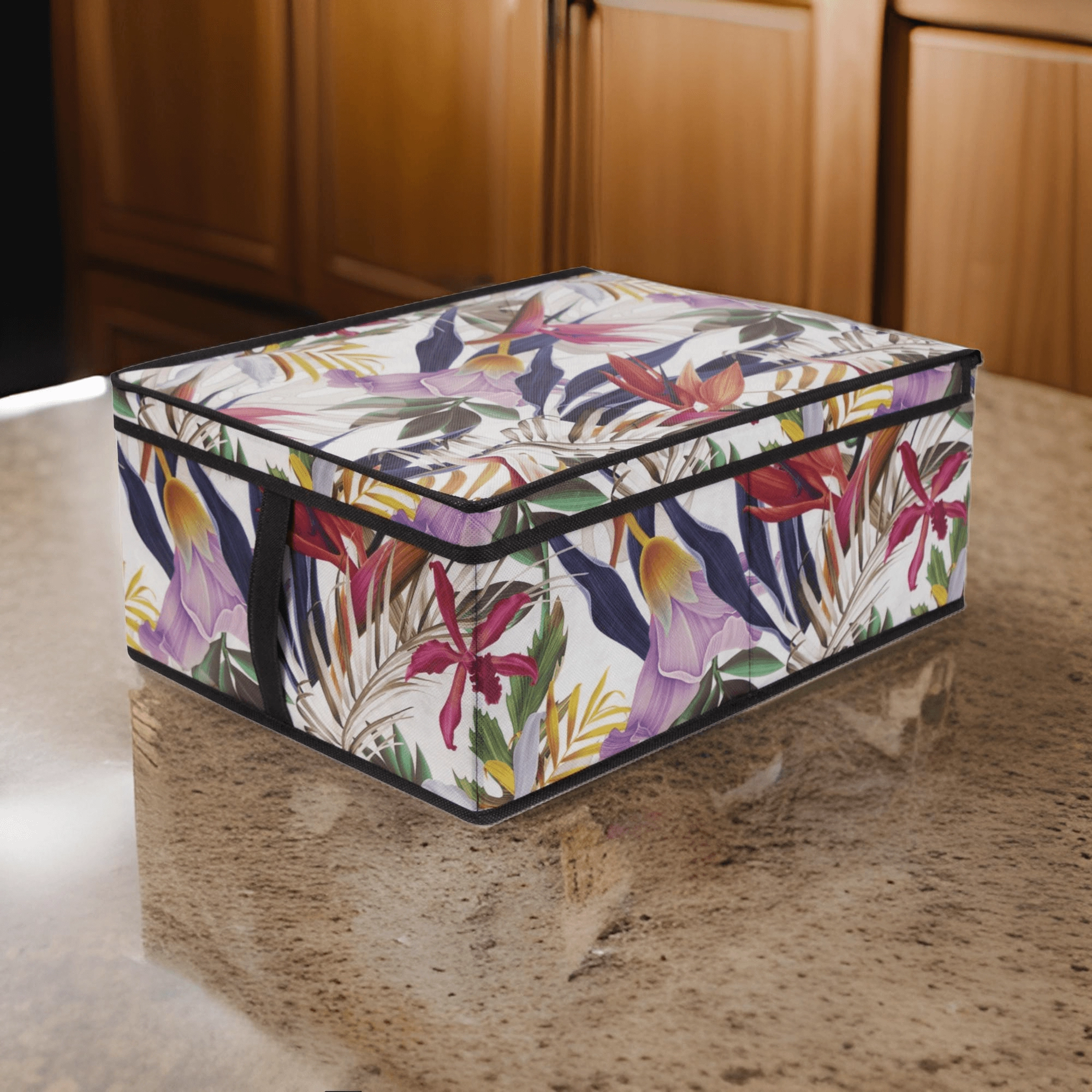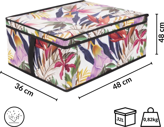 Stylový úložný box s tropickým květinovým vzorem pomůže udržet pořádek v každé místnosti. Díky rozměrům 48 × 36 × 19 cm je ideální na oblečení, ložní prádlo, hračky i doplňky. Má zipové víko proti prachu, postranní ucha pro snadné přenášení a skládací konstrukci, která šetří místo, když ho zrovna nepoužíváte. Vyroben z odolného PET netkaného materiálu v mnohobarevném květinovém designu.