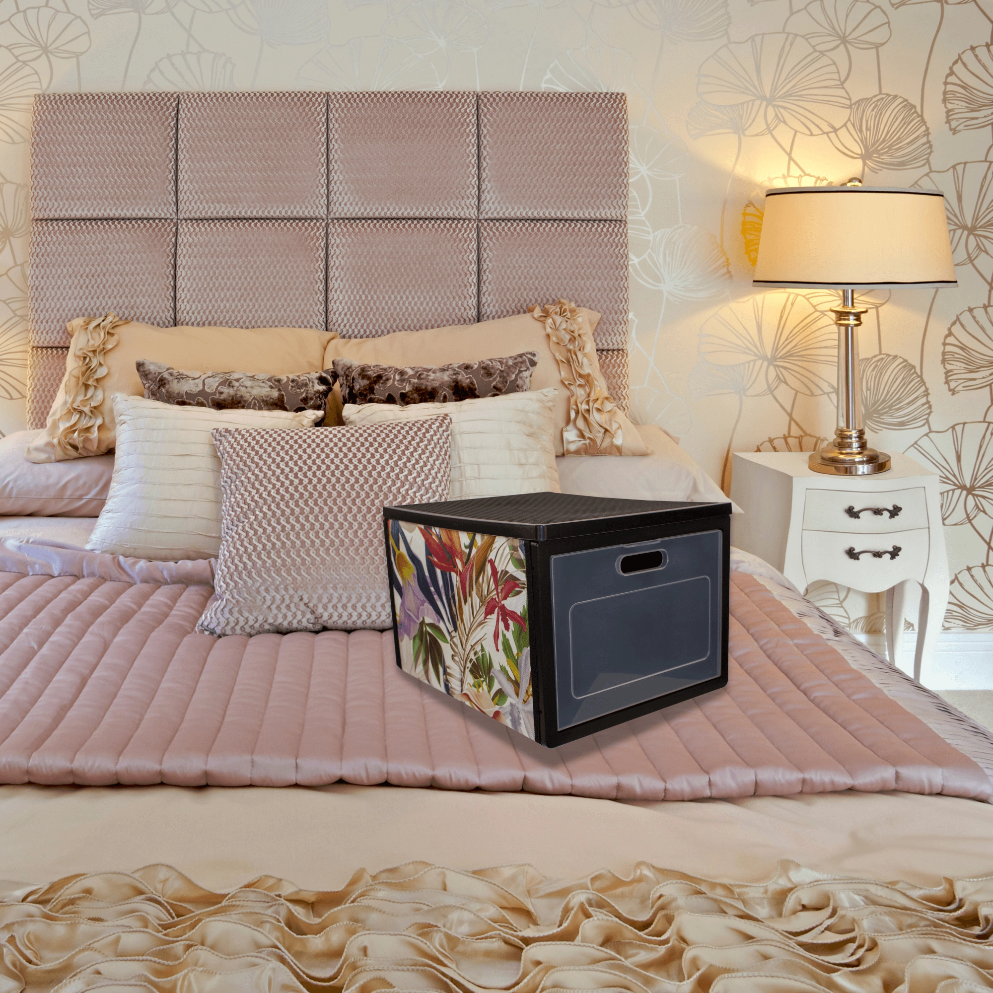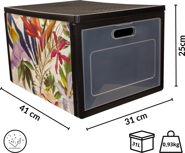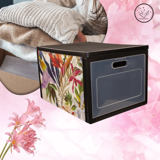 Stylový organizér z kolekce FLORAL pomůže udržet pořádek ve skříni i domácnosti. Má čelní průhledná dvířka pro rychlý přístup bez vysouvání boxu, je skládací, lehký a vyrobený z odolného netkaného PET. Ideální na oblečení, ložní prádlo, doplňky či dokumenty.