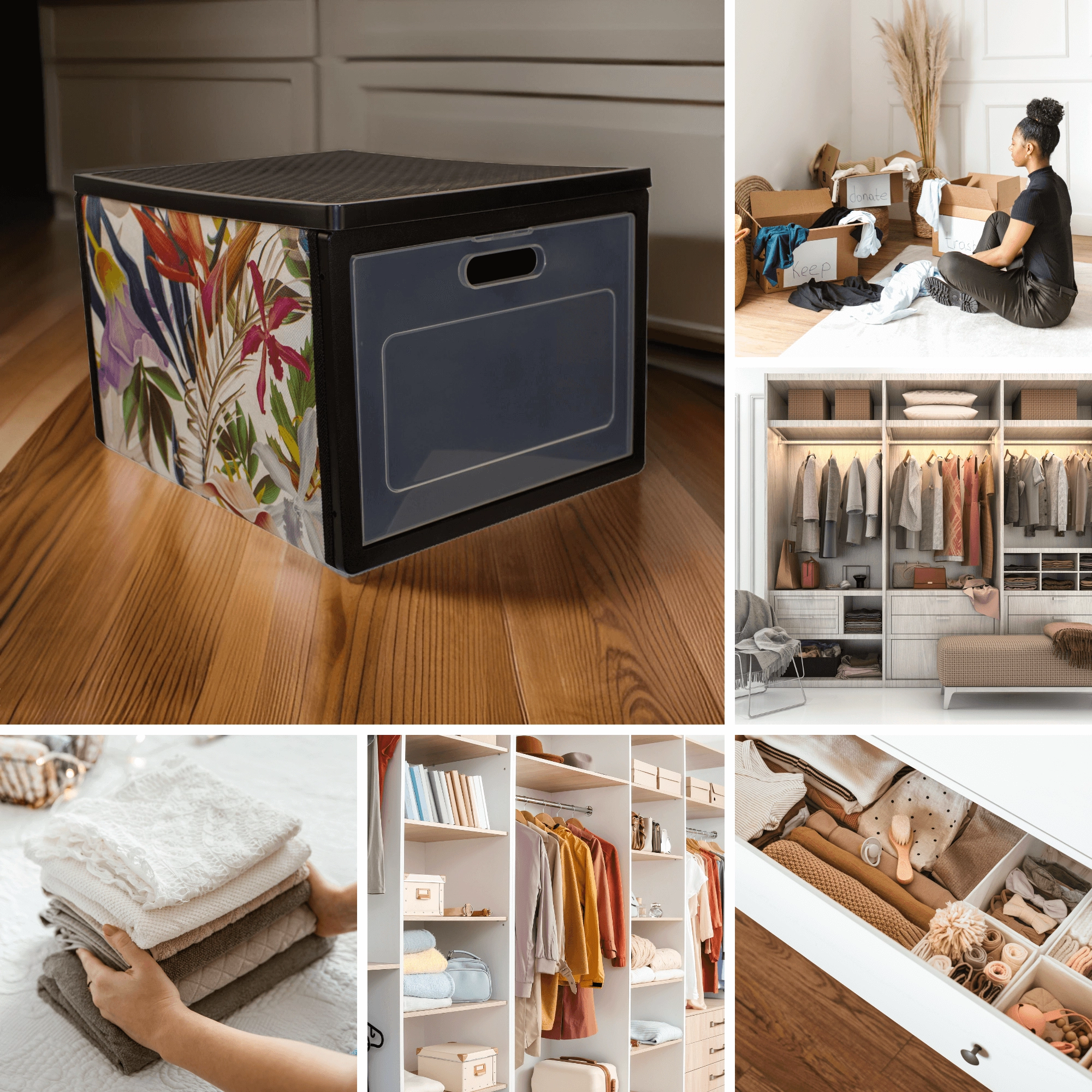 Kombinujte více boxů FLORAL a vytvořte přehledný systém organizace oblečení, doplňků a ložního prádla.