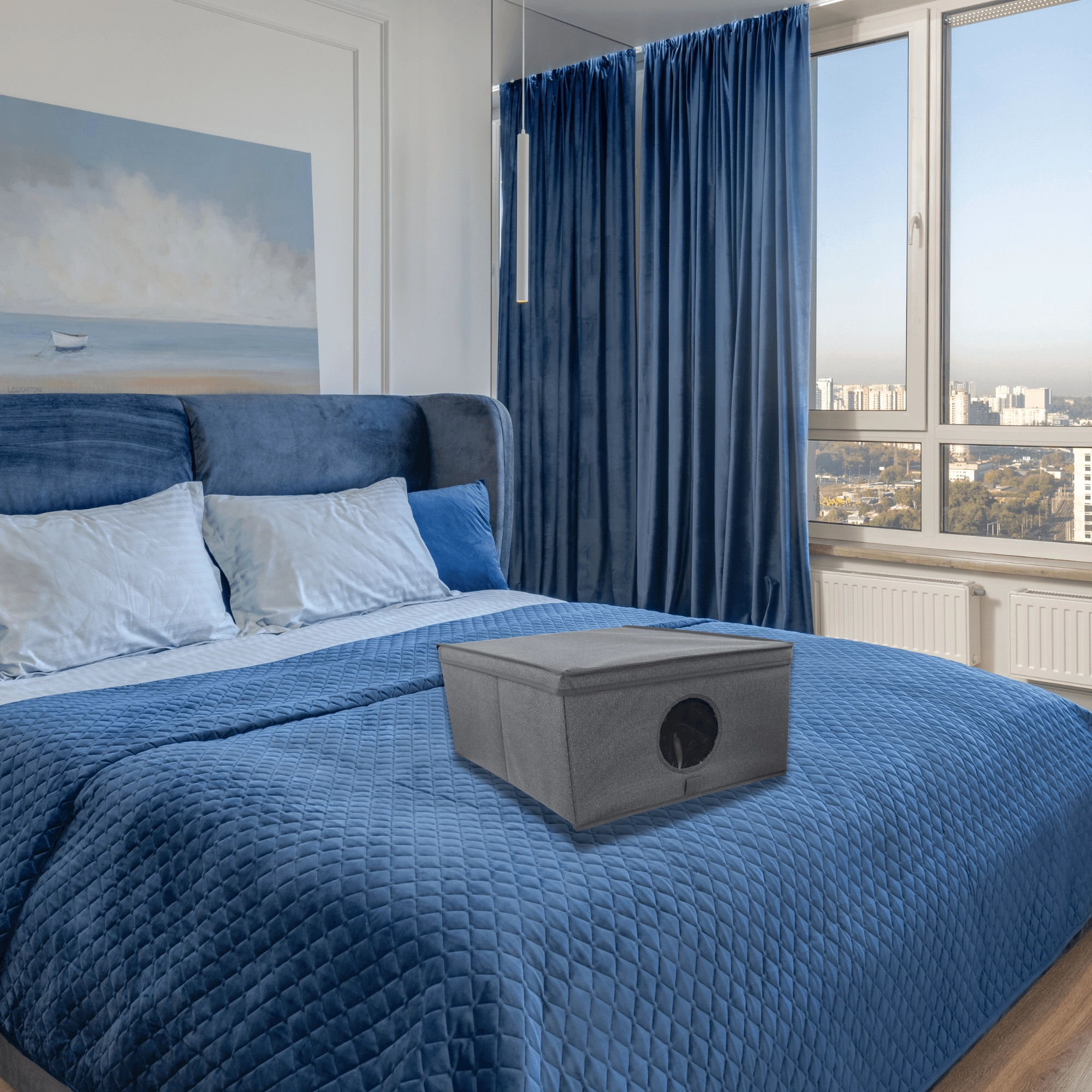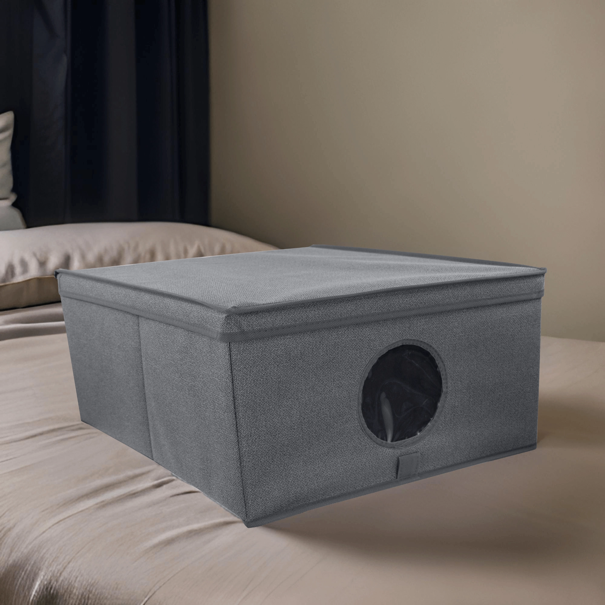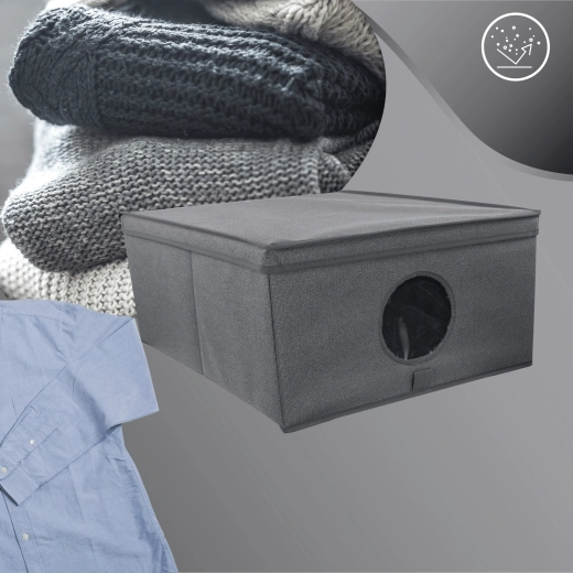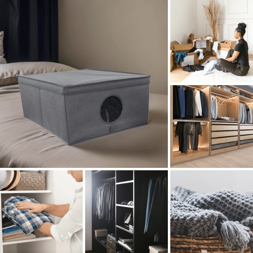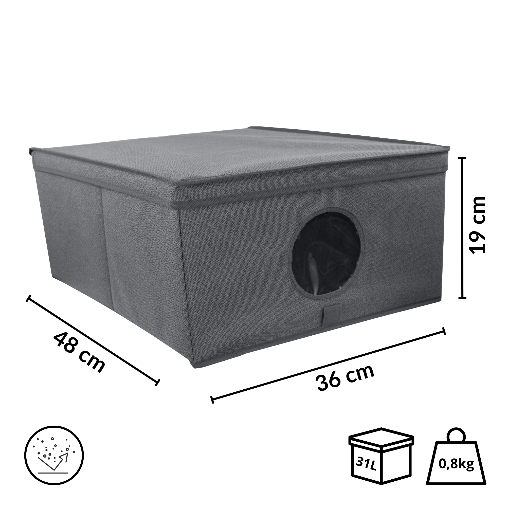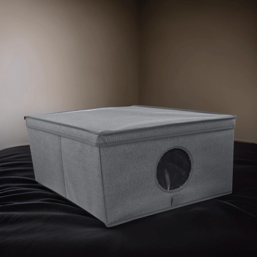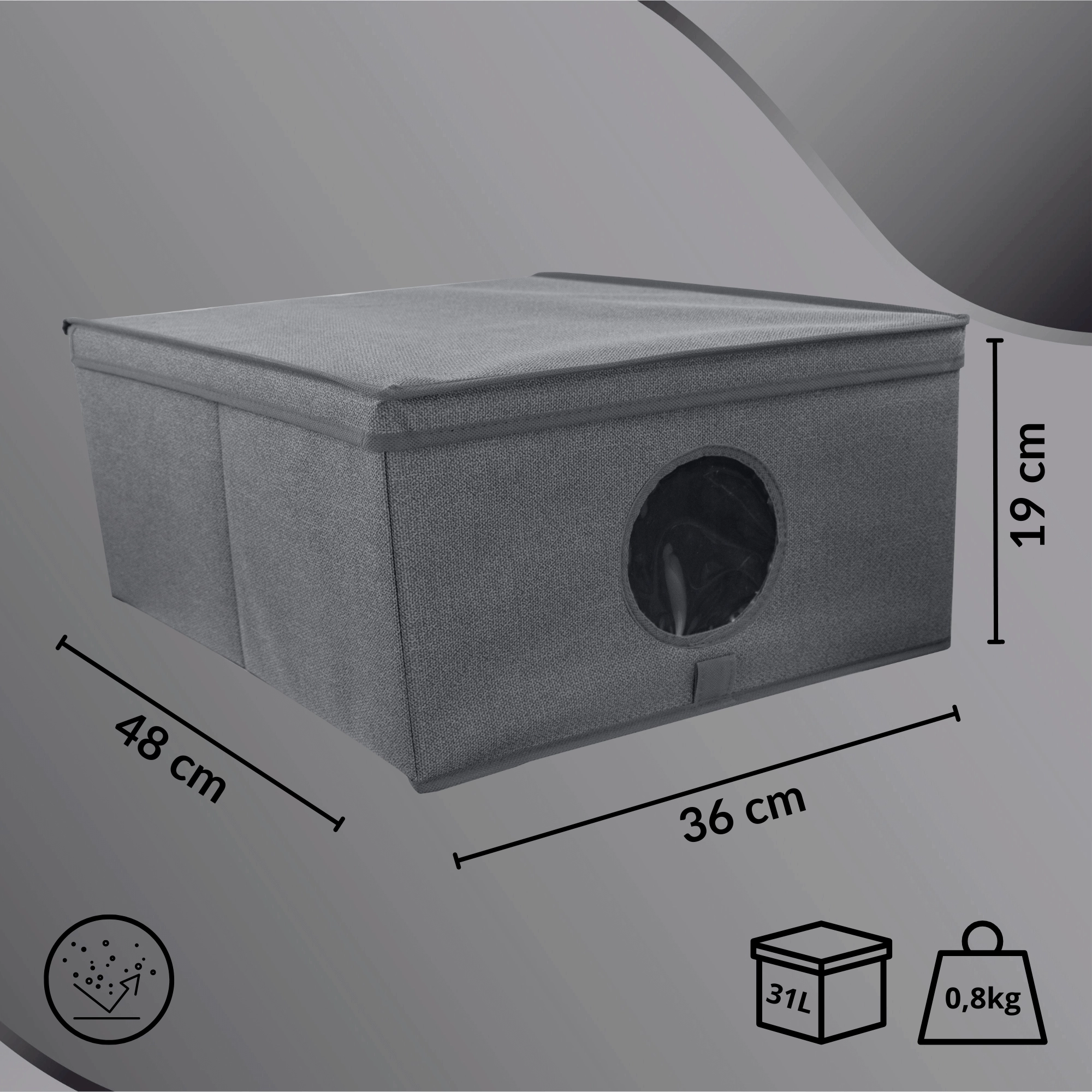 Udržujte domov dokonale přehledný se stylovým šedým boxem na uložení oblečení a doplňků. Díky průhlednému okénku máte obsah vždy na očích, zatímco víko jej chrání před prachem. Organizér z pevné netkané textilie má moderní minimalistický design, skládací konstrukci a průhledné okénko pro rychlou orientaci – ideální do skříně, ložnice i dětského pokoje.