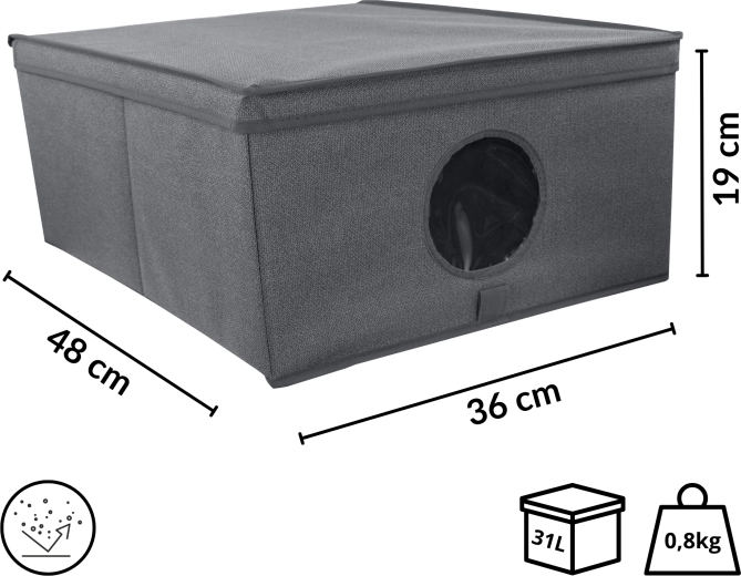 Box je vyroben z pevné netkané textilie se zpevněným dnem pro lepší stabilitu. Minimalistické provedení bez bočních úchytů působí čistě a uklizeně na policích i v šatně. Díky skládací konstrukci ho složíte naplocho, když jej zrovna nepoužíváte.