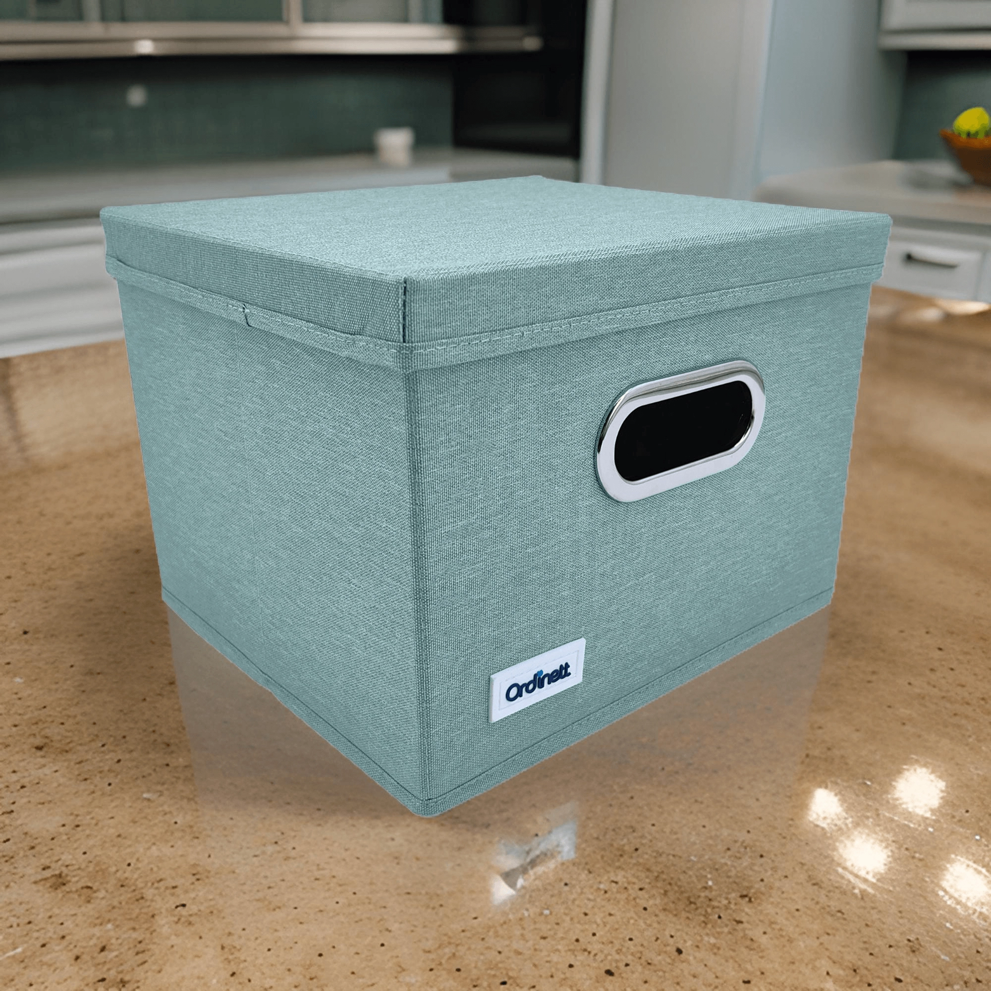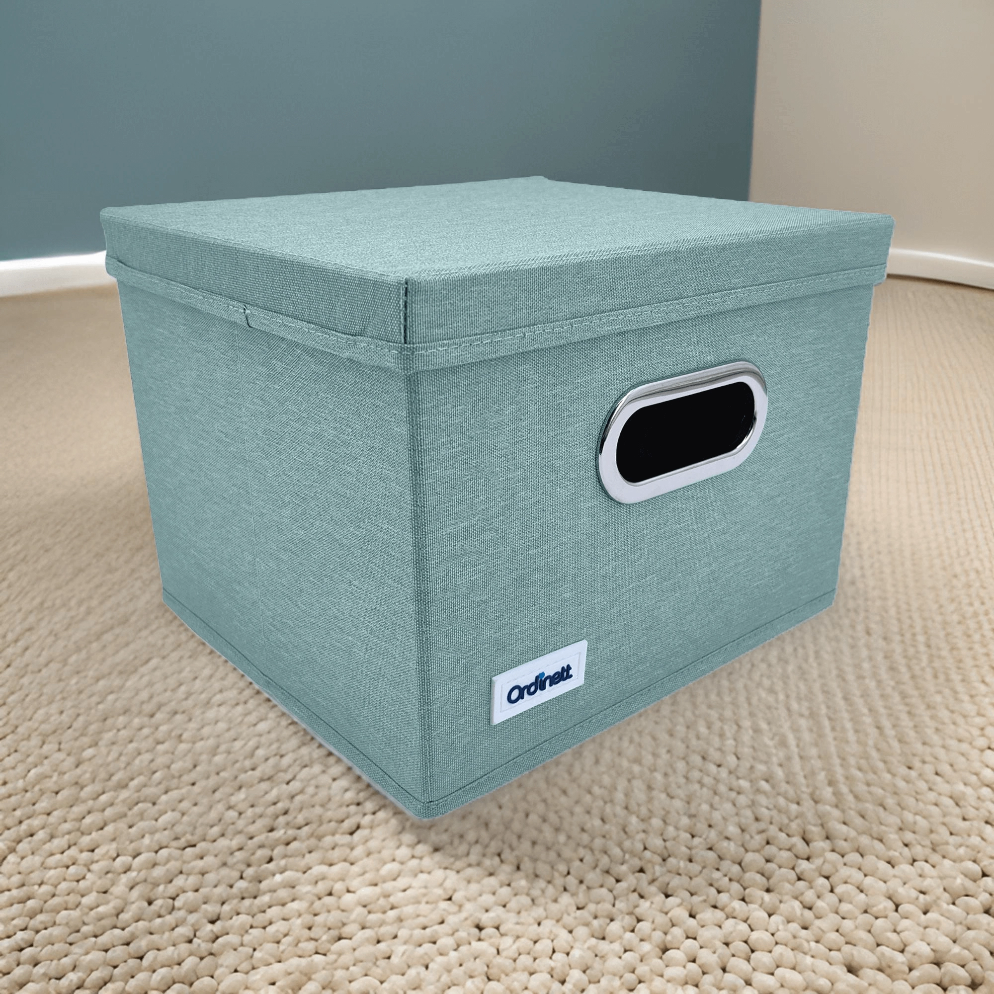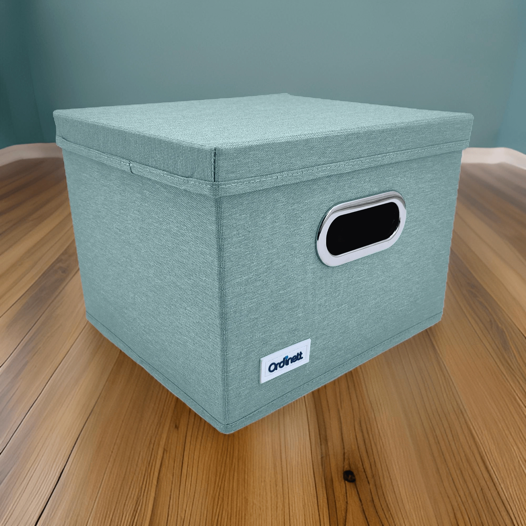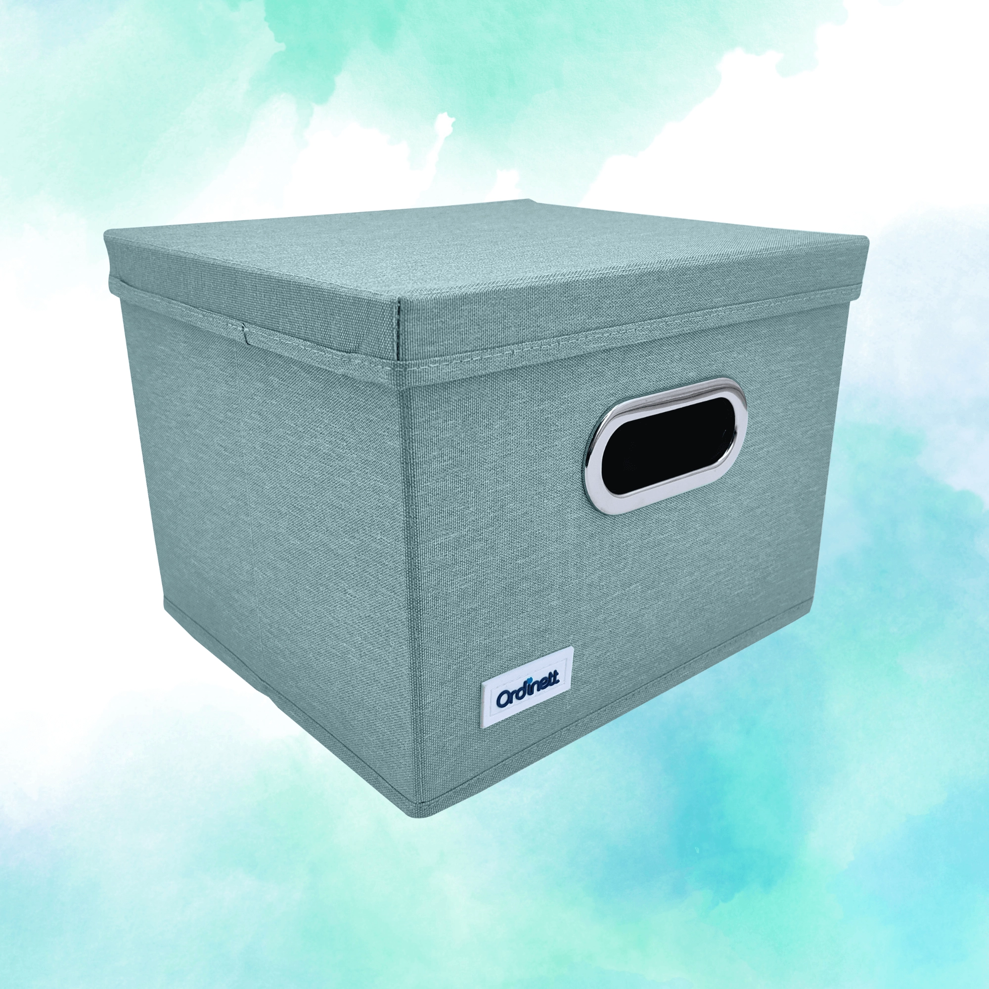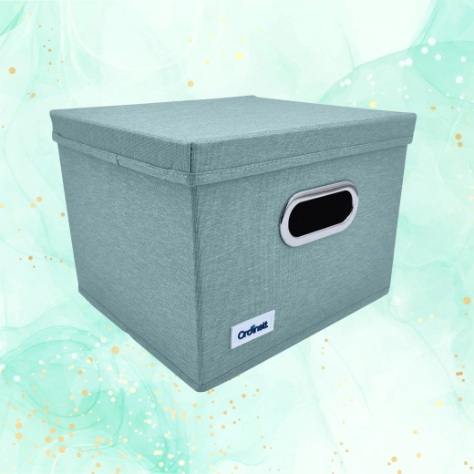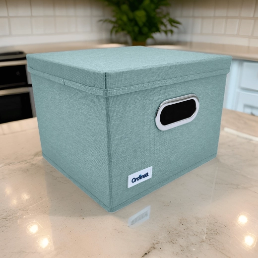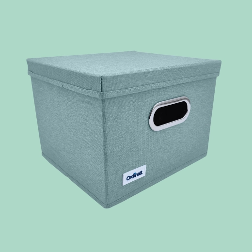 Elegantní box v jemném mátovém odstínu vnese do interiéru klid a pořádek. Díky pevnému víku lze obsah bezpečně zakrýt a snadno stohovat, zatímco přední úchyt s kovovým lemem umožní pohodlné vysunutí z polic a skříněk.