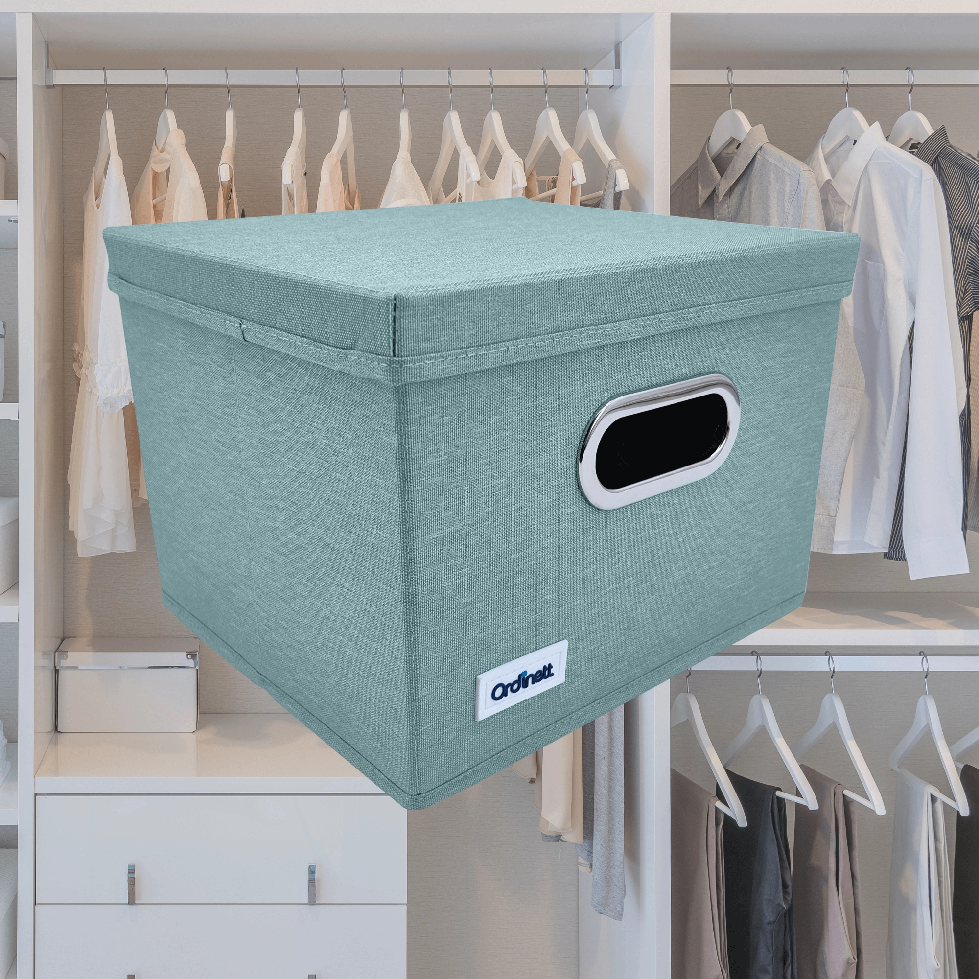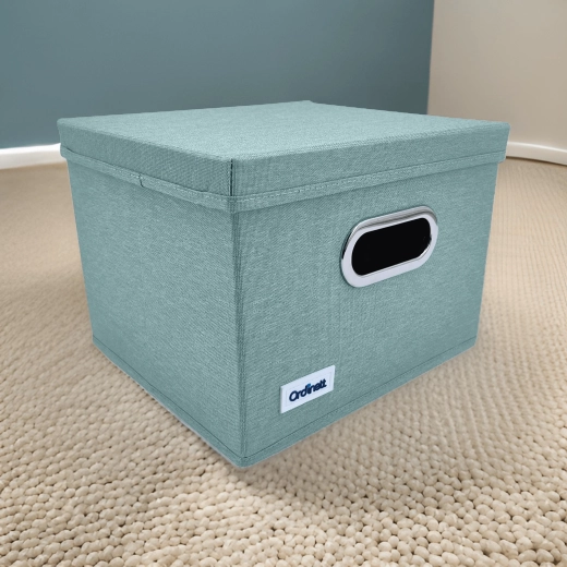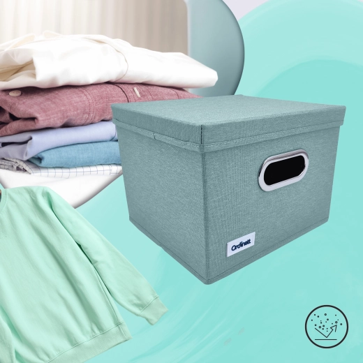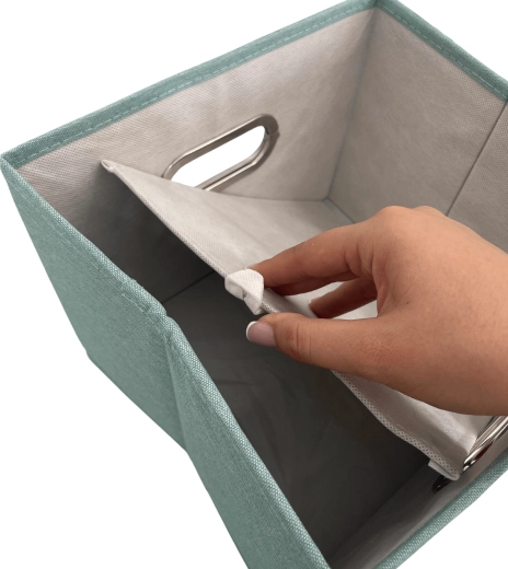 Uspořádejte si skříň stylově i prakticky. Tento mátově zelený úložný box z polyesteru má pevné odnímatelné víko, kovově lemované úchytové oko pro snadné vysouvání ze skříňky a skládací konstrukci se zpevněným dnem. Ideální na oblečení, spodní prádlo, hračky i knihy a skvěle udrží doma pořádek i bezprašné uložení.