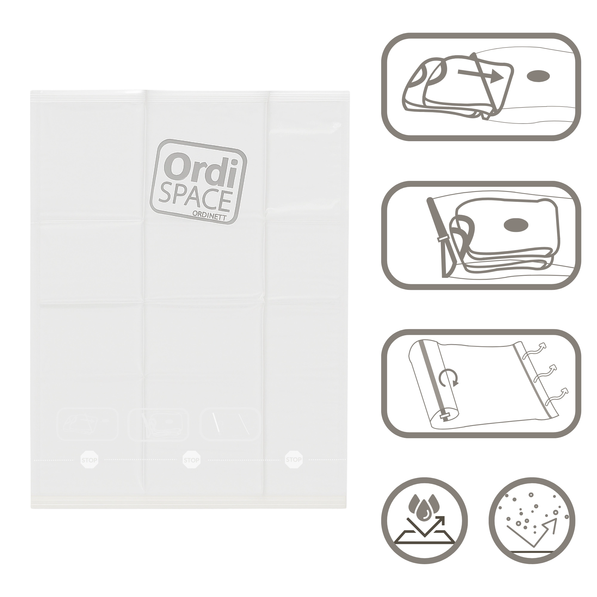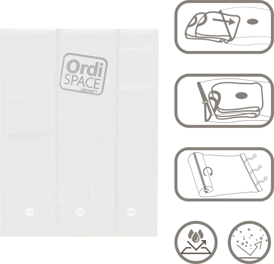 Praktický vakuový sáček velikosti M (42 × 50 cm) z odolného PE materiálu šetří místo až o 75 %. Díky konstrukci bez ventilu stačí sáček jednoduše zrolovat a vytlačit vzduch bez použití vysavače. Je voděodolný, znovupoužitelný a spolehlivě chrání oděvy před prachom, vlhkostí a zápachem – ideální do kufru, skříně i domácích úložišť.