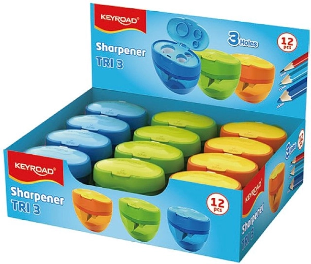 Ořezávátko Keyroad Tri Plus je univerzální řešení pro všechny typy psacích potřeb. Díky třem průměrům otvorů (8 mm, 11 mm a 16 mm) snadno ořežete standardní tužky, klasické pastelky i silné jumbo pastelky. Integrovaný kontejner s velkou kapacitou udrží pracovní plochu bez nepořádku a průhledné víčko brání nechtěnému vysypání odřezků.